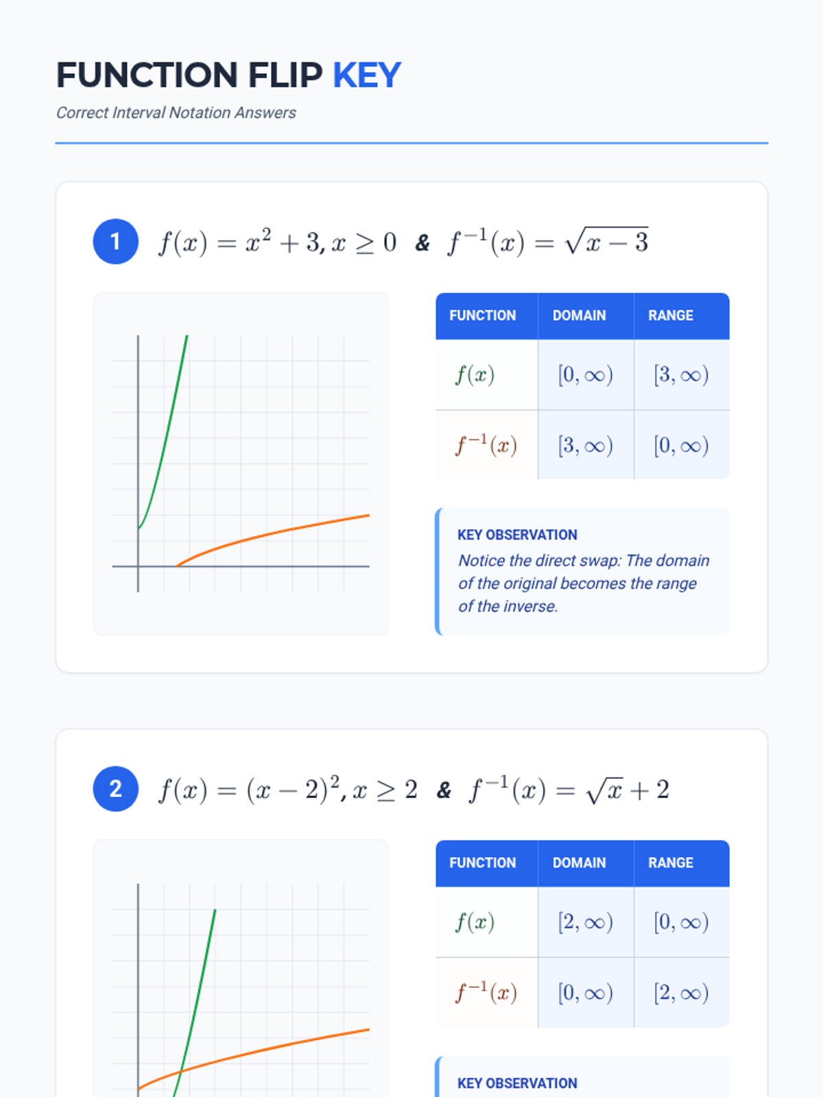 A complete answer key for the Function Flip Worksheet, providing correct interval notation and brief instructional notes for each problem. Includes corrected graphs and optimized page layout.