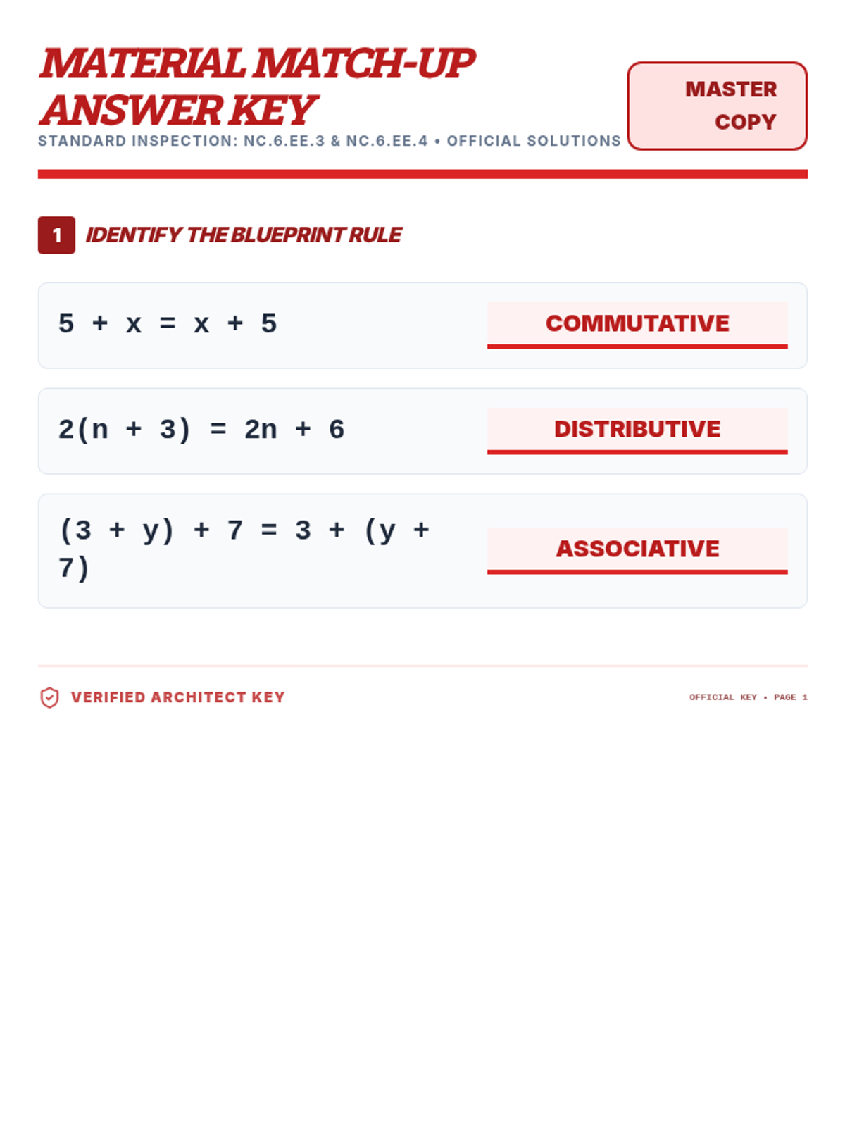 The official answer key for the Material Match-Up Worksheet. Provides solved property identifications and clear verification steps using substitution. Revised for page breaks, contrast, and layout.