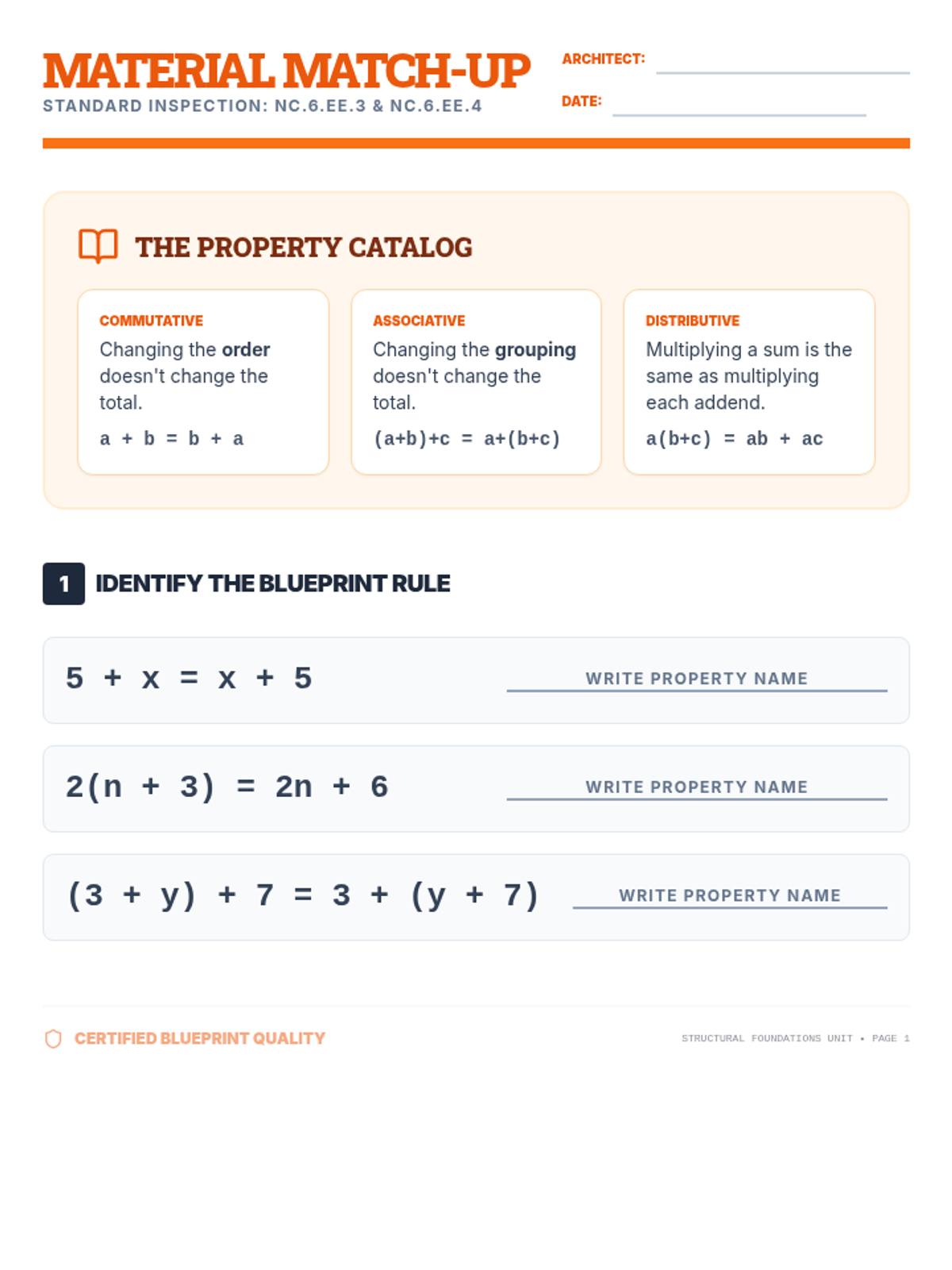 A practice worksheet for Lesson 2 (NC.6.EE.3-4) where students identify properties of operations and test expressions for equivalence using substitution. Revised for page breaks, larger work areas, and added visual support for struggling learners.