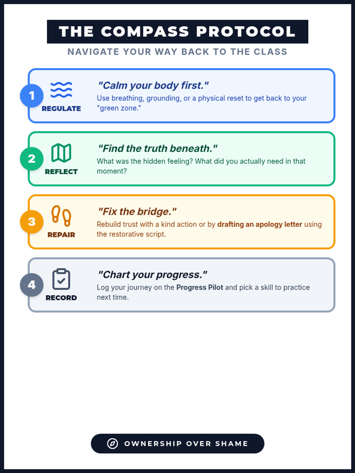 A classroom anchor chart/poster that provides a visual overview of the 4-step Compass Protocol, reinforcing the Regulate, Reflect, Repair, and Record phases.