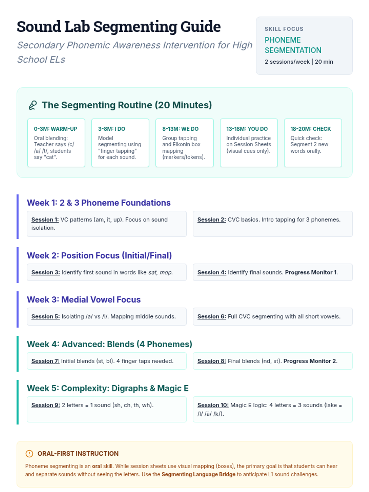 A revised 5-week teacher-facing intervention guide for high school ELs, focusing on the routines and objectives for phoneme segmentation fluency. Fixed raw markdown and alert box page-breaking.