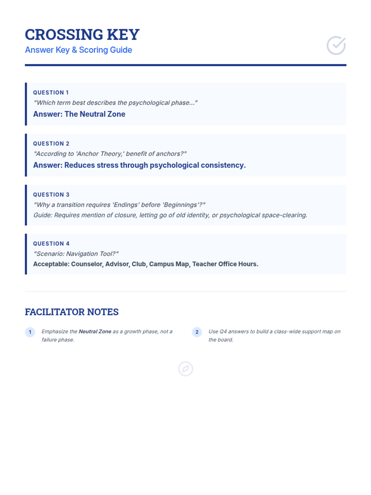 An answer key and facilitator guide for the Final Crossing quiz, including rationales for correct answers and sample open-ended responses.