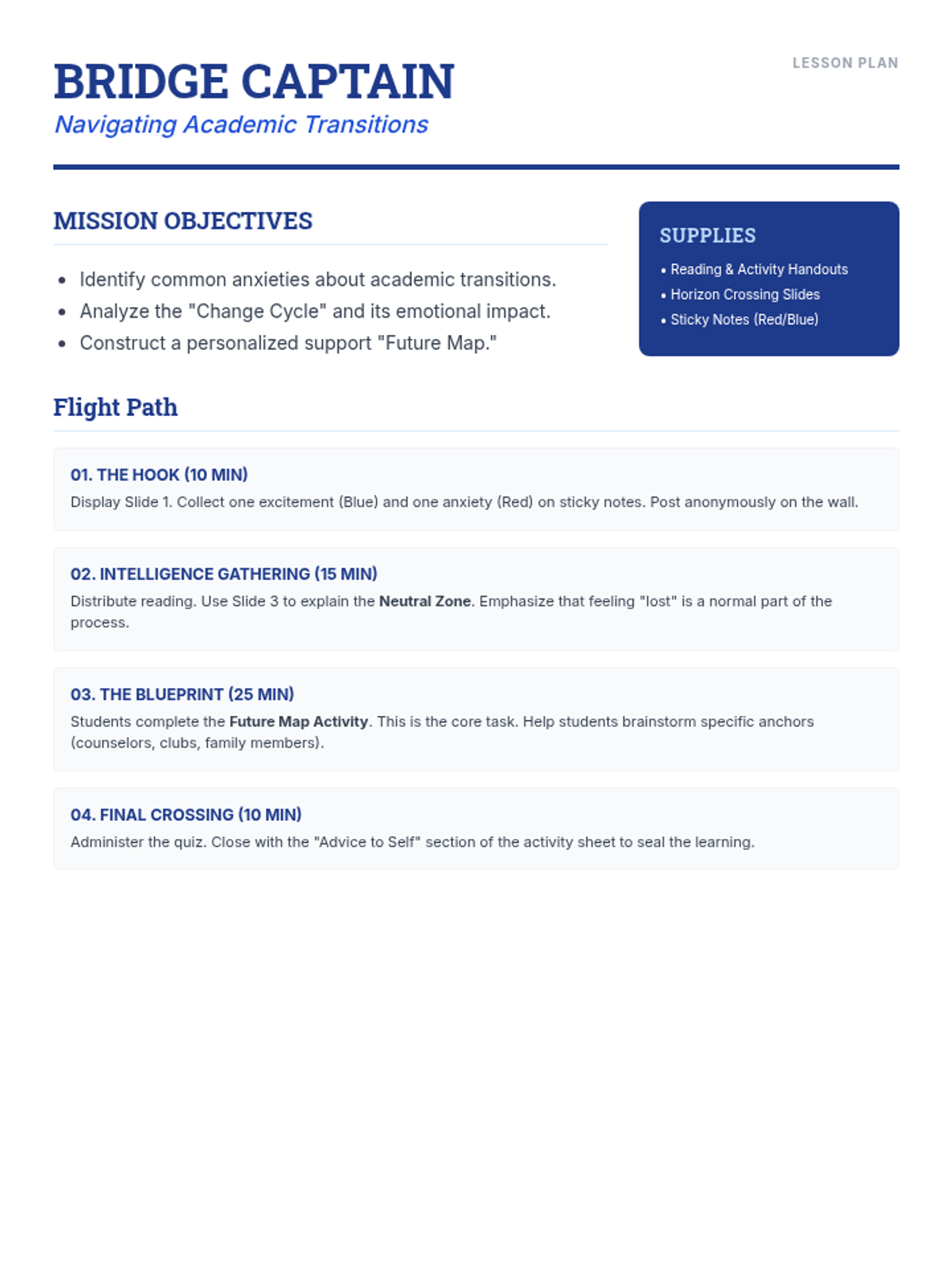 A facilitator guide for teachers to lead students through academic transitions, featuring a step-by-step flight path, supply lists, and grade-specific differentiation strategies for 8th and 12th graders.