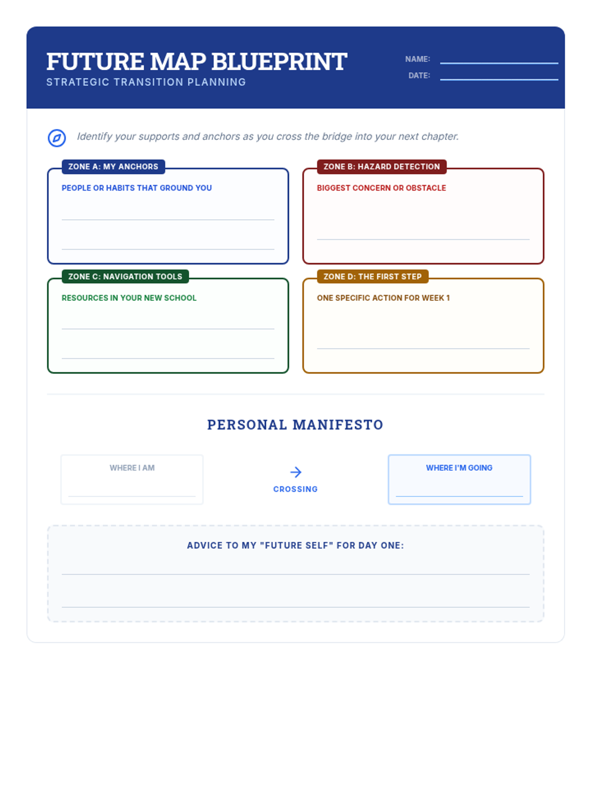 A structured 'Future Map' worksheet where students identify their personal anchors, detect potential hazards, list new resources, and write a manifesto for their academic transition.