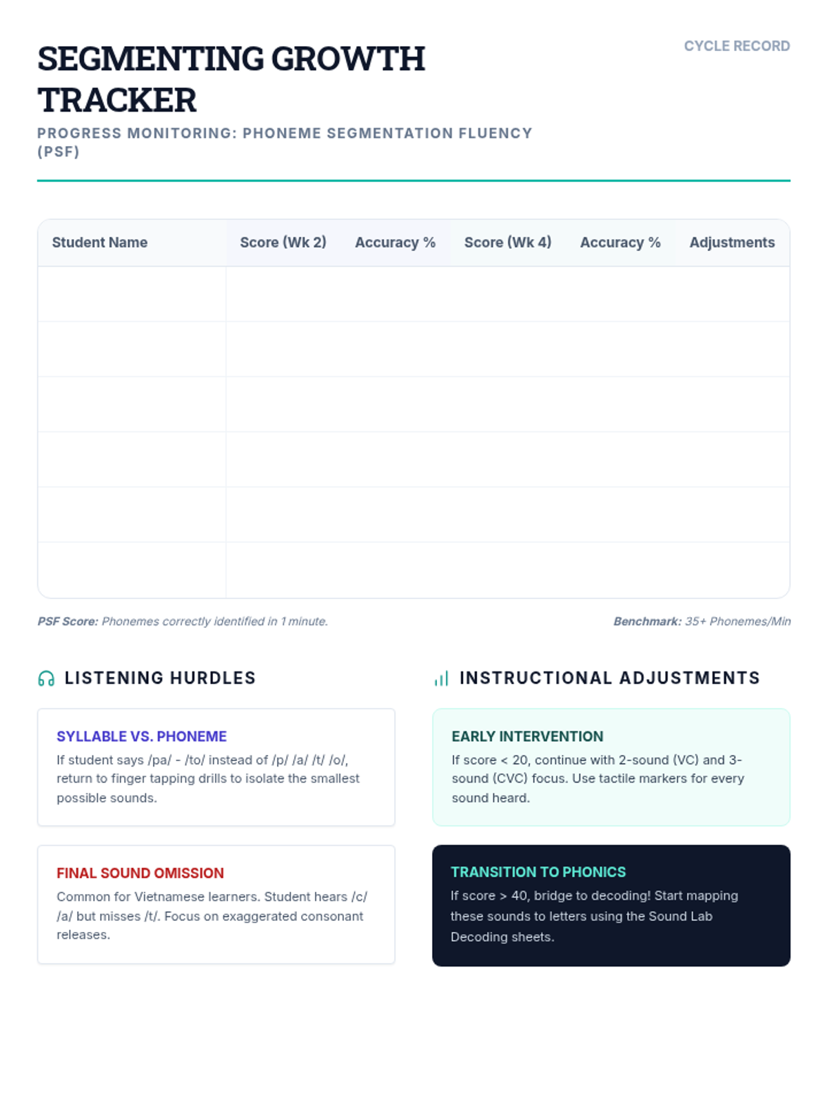A revised tracking sheet for Phoneme Segmentation Fluency (PSF), with fixed HTML tags and improved formatting for secondary instructors.
