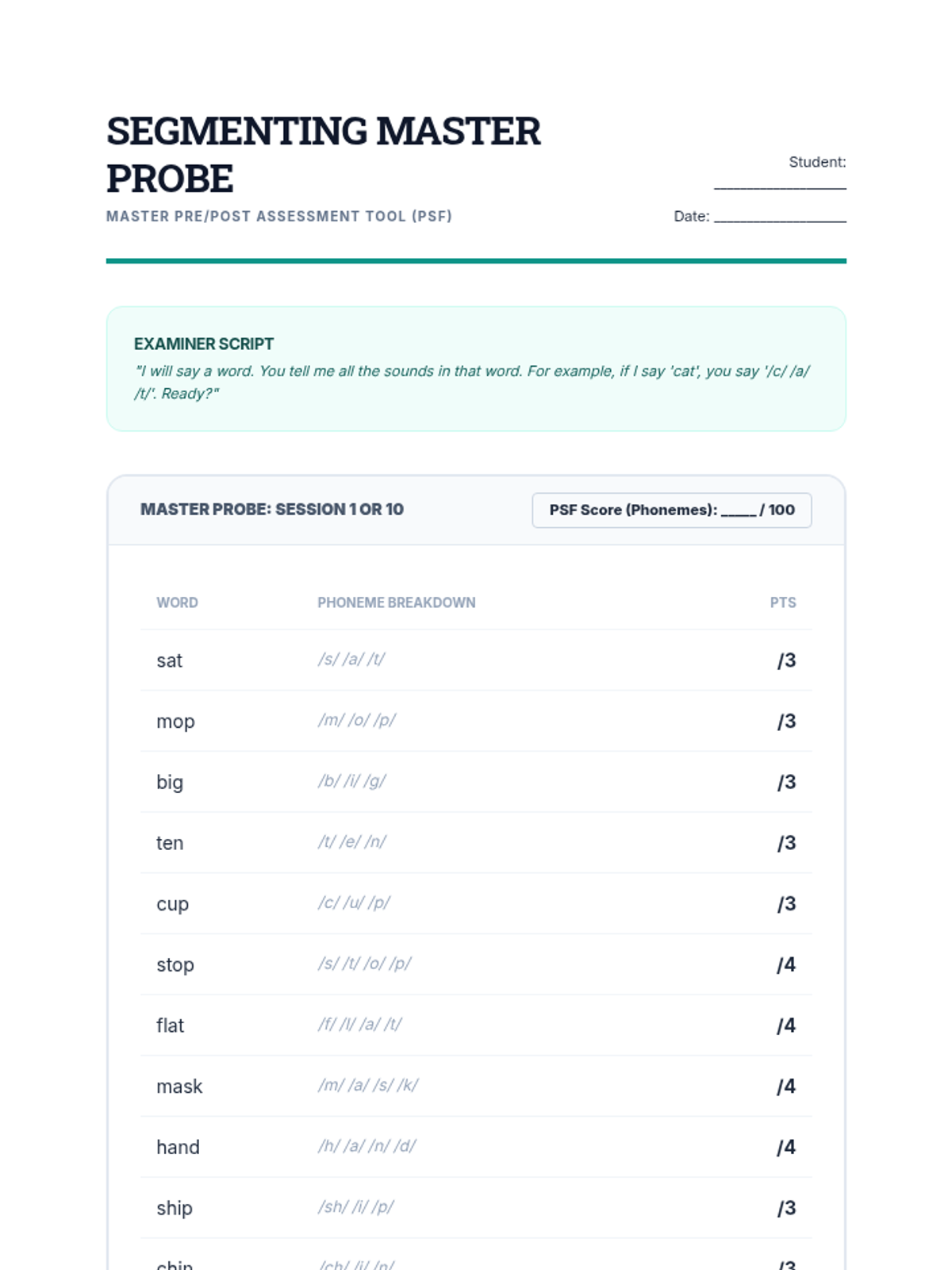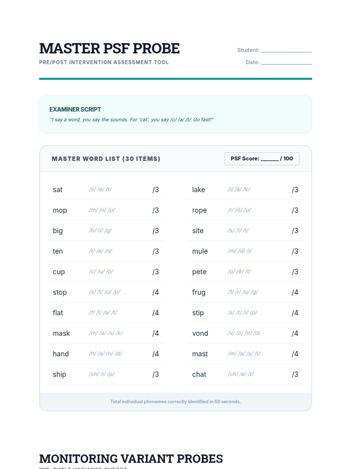 A comprehensive assessment pack for Phoneme Segmentation Fluency (PSF), featuring a master probe and two variant monitoring options for biweekly data collection.