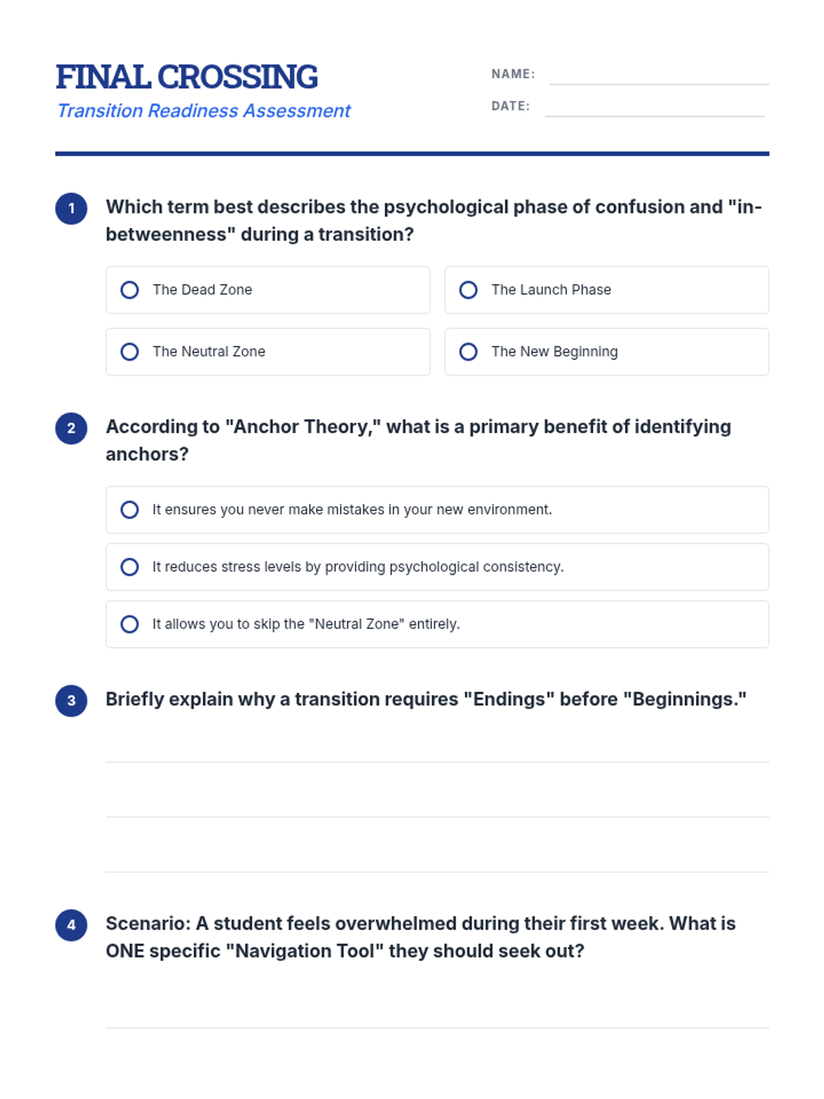 A summative assessment for students to verify their understanding of transition psychology, including the 'Neutral Zone' and the importance of anchors.