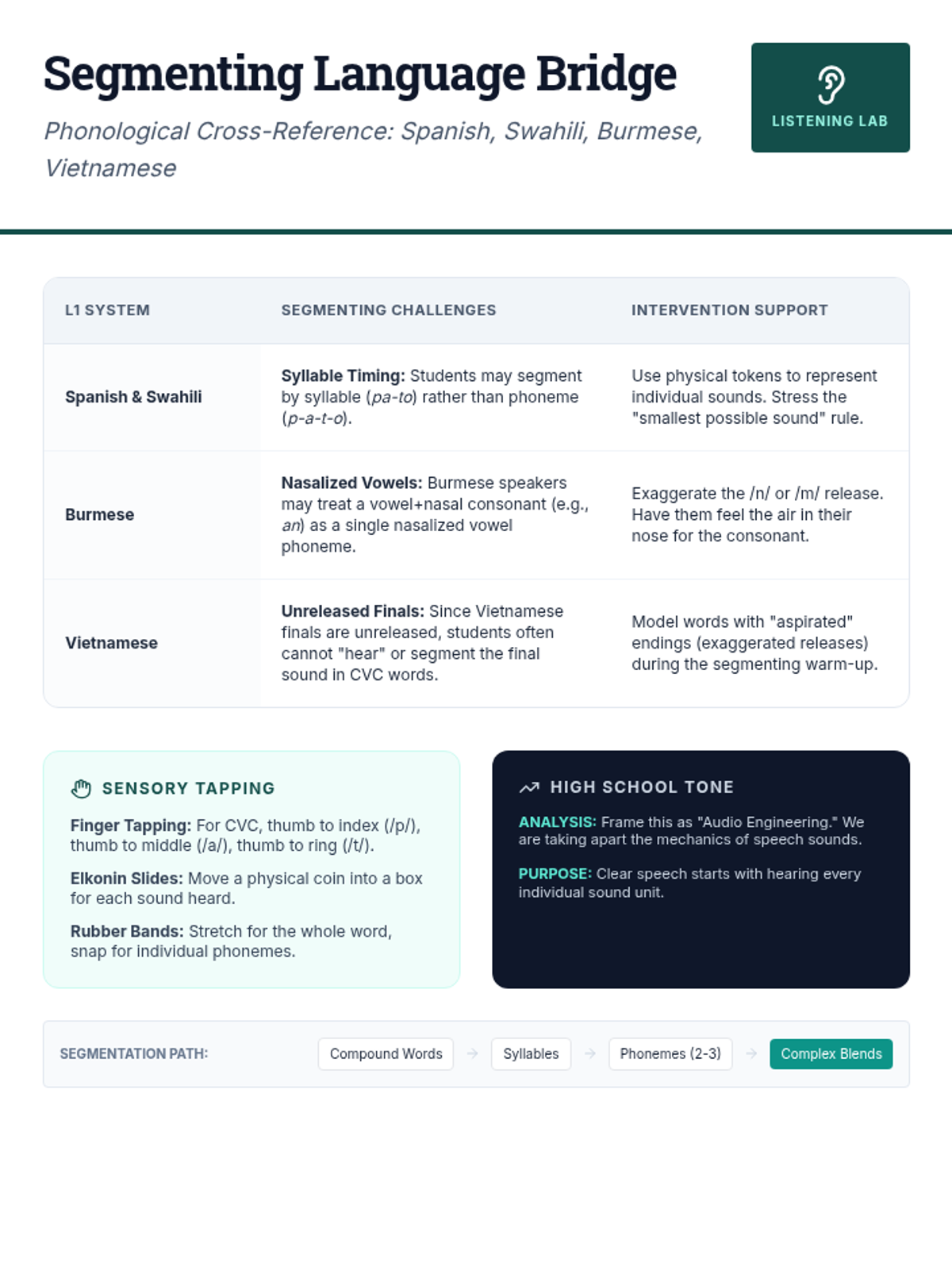 A consolidated reference sheet for teachers focusing on phonological awareness and segmentation challenges specific to Spanish, Swahili, Burmese, and Vietnamese speakers.