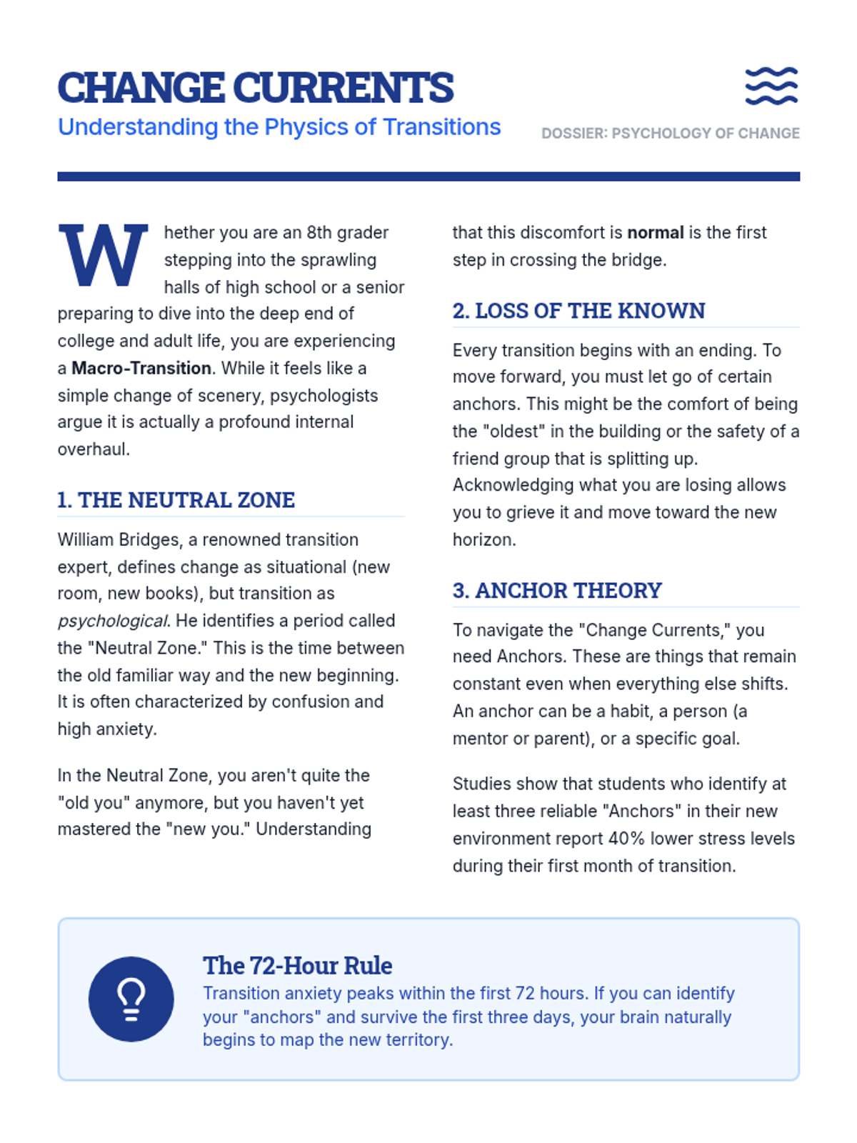 A visual presentation to guide students through the emotional and practical phases of academic transitions, featuring the 'Change Cycle' diagram and prompts for identifying personal anchors.