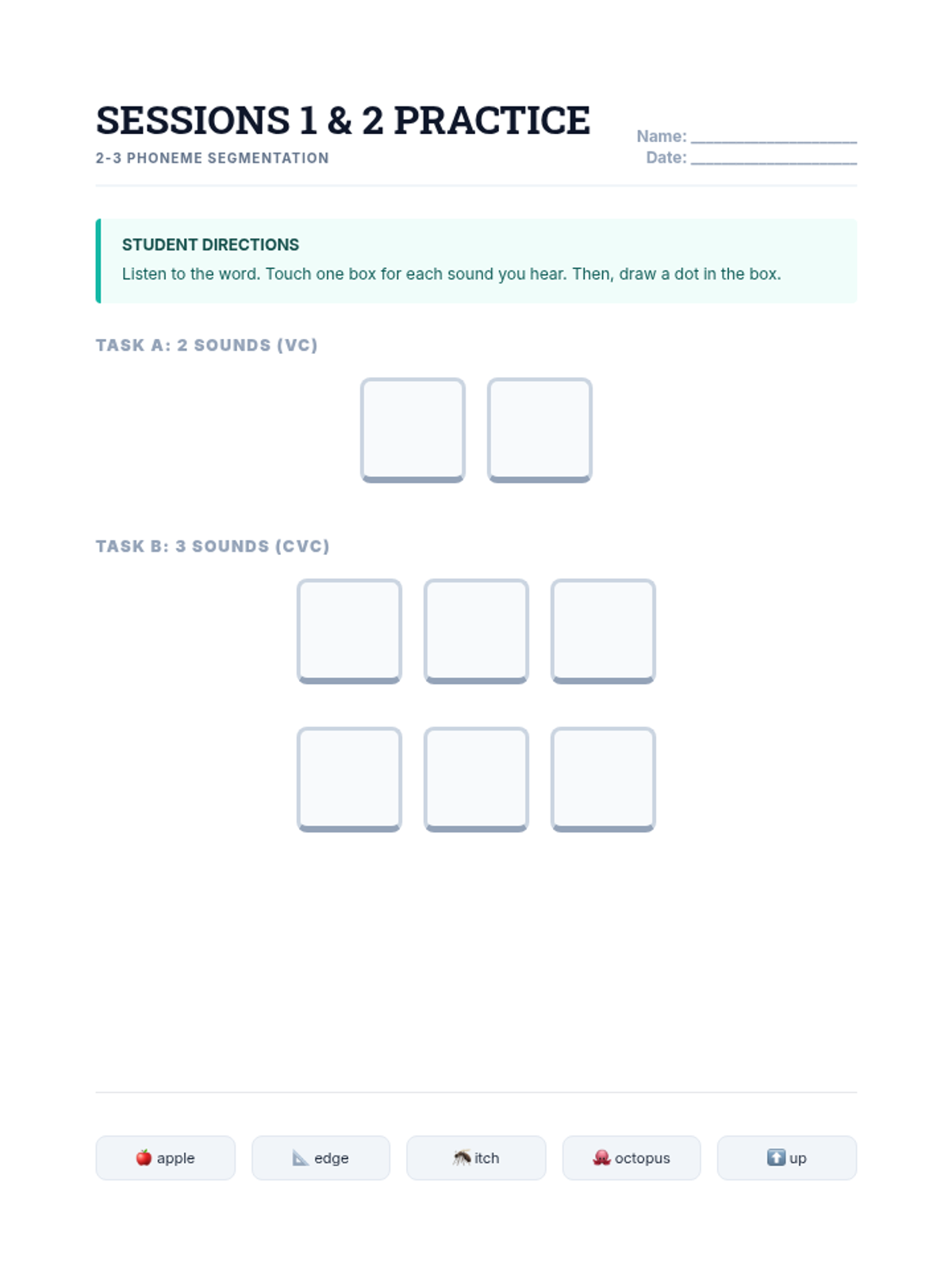 A student practice pack for phoneme segmentation, updated with neutral isolation styling, name/date headers on every page, and a dedicated Magic E logic page.