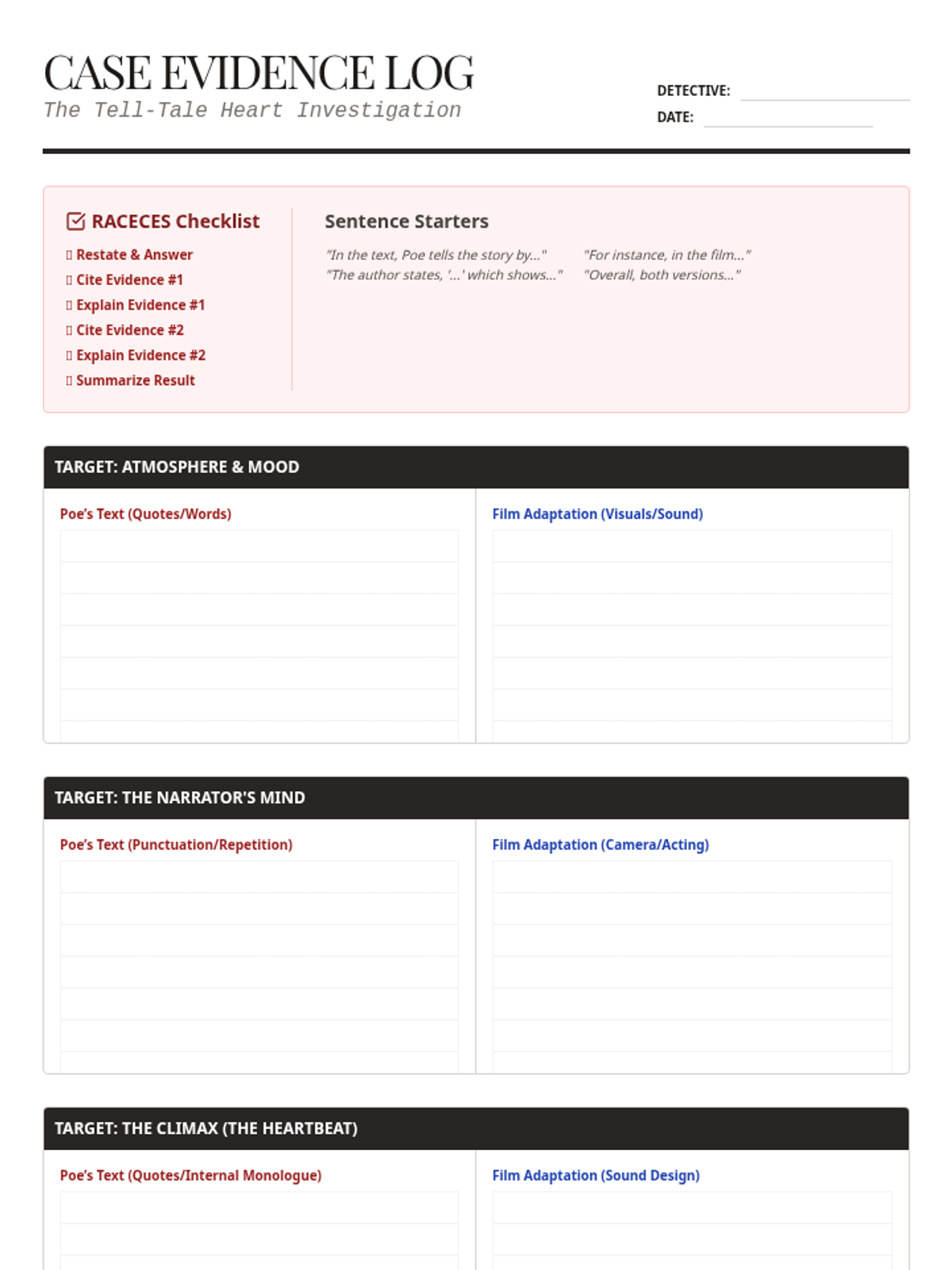 A graphic organizer for collecting specific evidence from both the text and film versions of 'The Tell-Tale Heart', categorized by mood, narrative voice, and key plot moments. Includes a synthesis area and writing prep checklist.