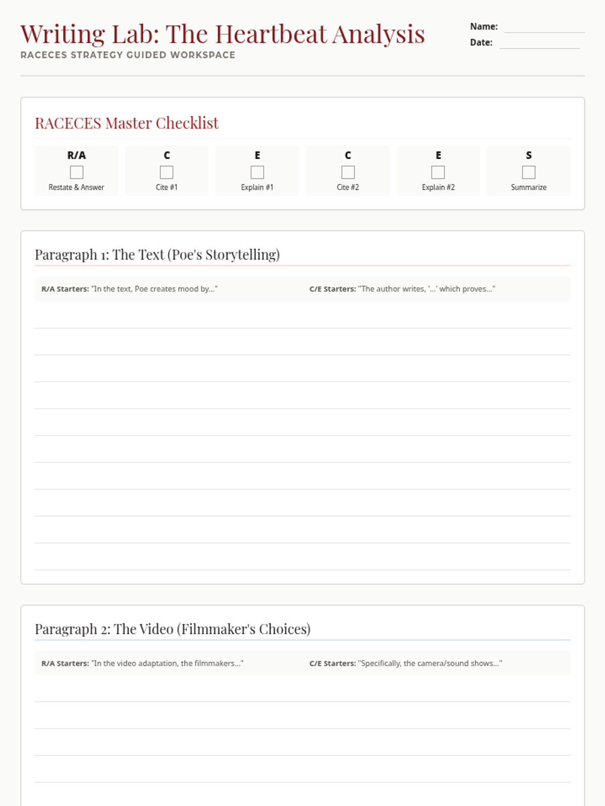 An executive functioning writing scaffold for the 3-paragraph comparison essay, featuring a RACECES visual checklist, specific sentence starters for each paragraph, and guided work areas. Optimized for print efficiency.