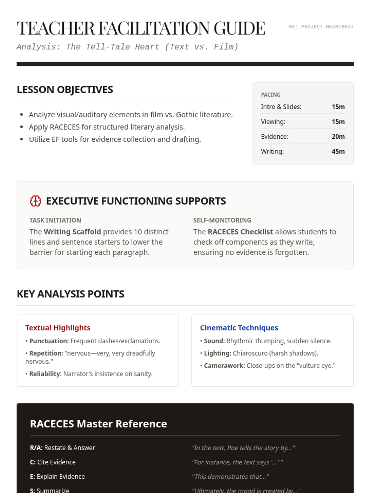 A professional guide for teachers facilitating the comparison project, including pacing suggestions, key Gothic analysis points, and a RACECES-aligned rubric. Now includes EF strategies and reference tools.