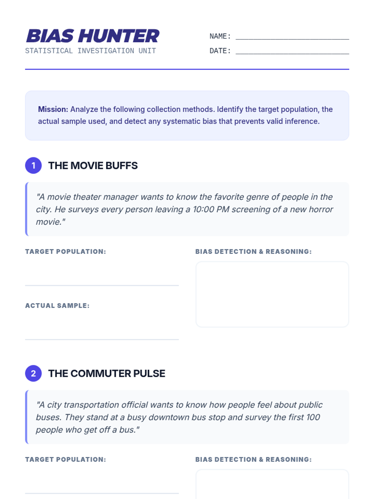An independent practice worksheet where students analyze real-world scenarios to identify populations, samples, and potential bias. Improved spacing and layout to prevent content splitting across pages.