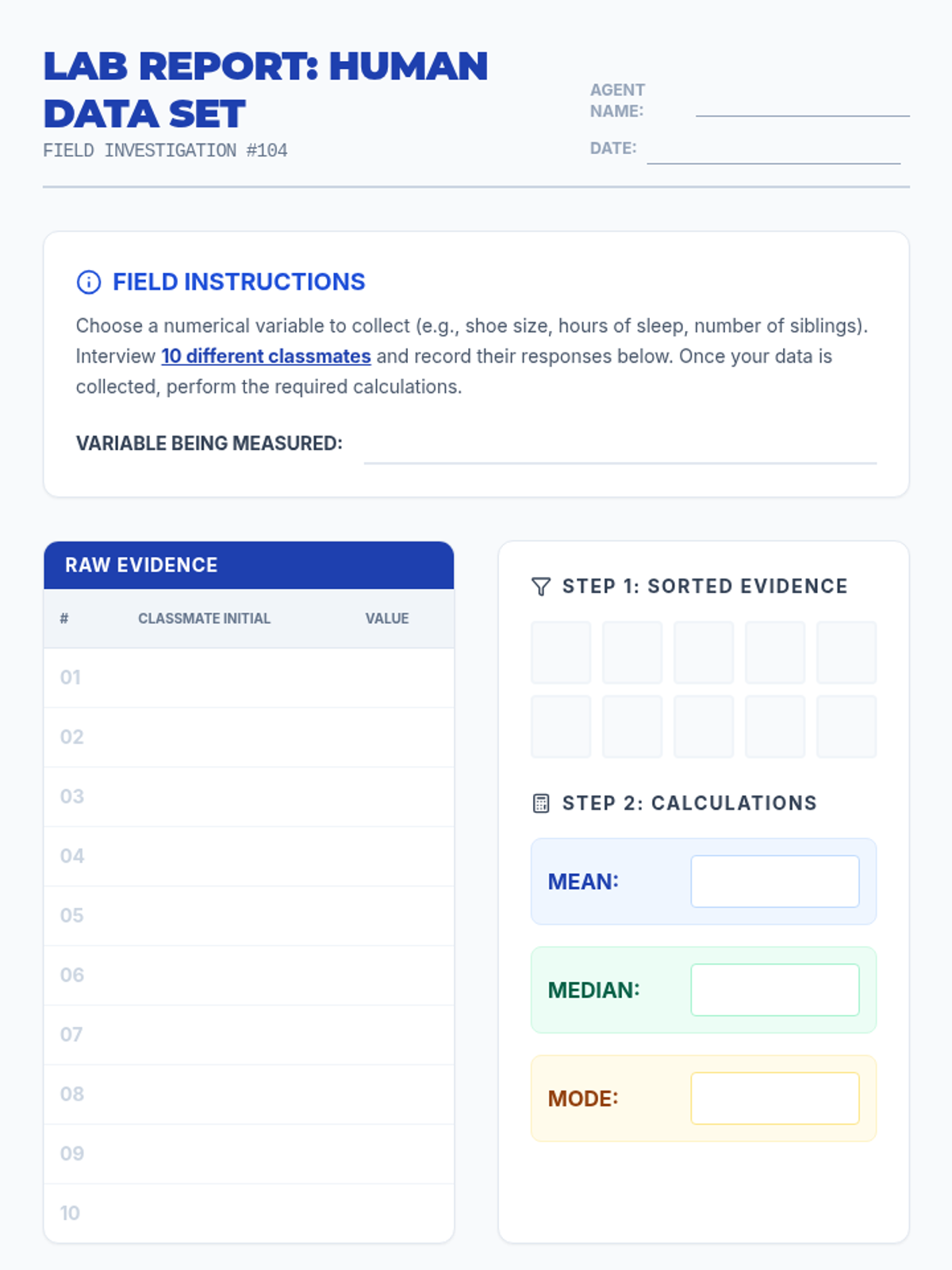 A data collection and analysis worksheet where students gather information from classmates to practice calculating mean, median, and mode in a 'Data Lab' format.