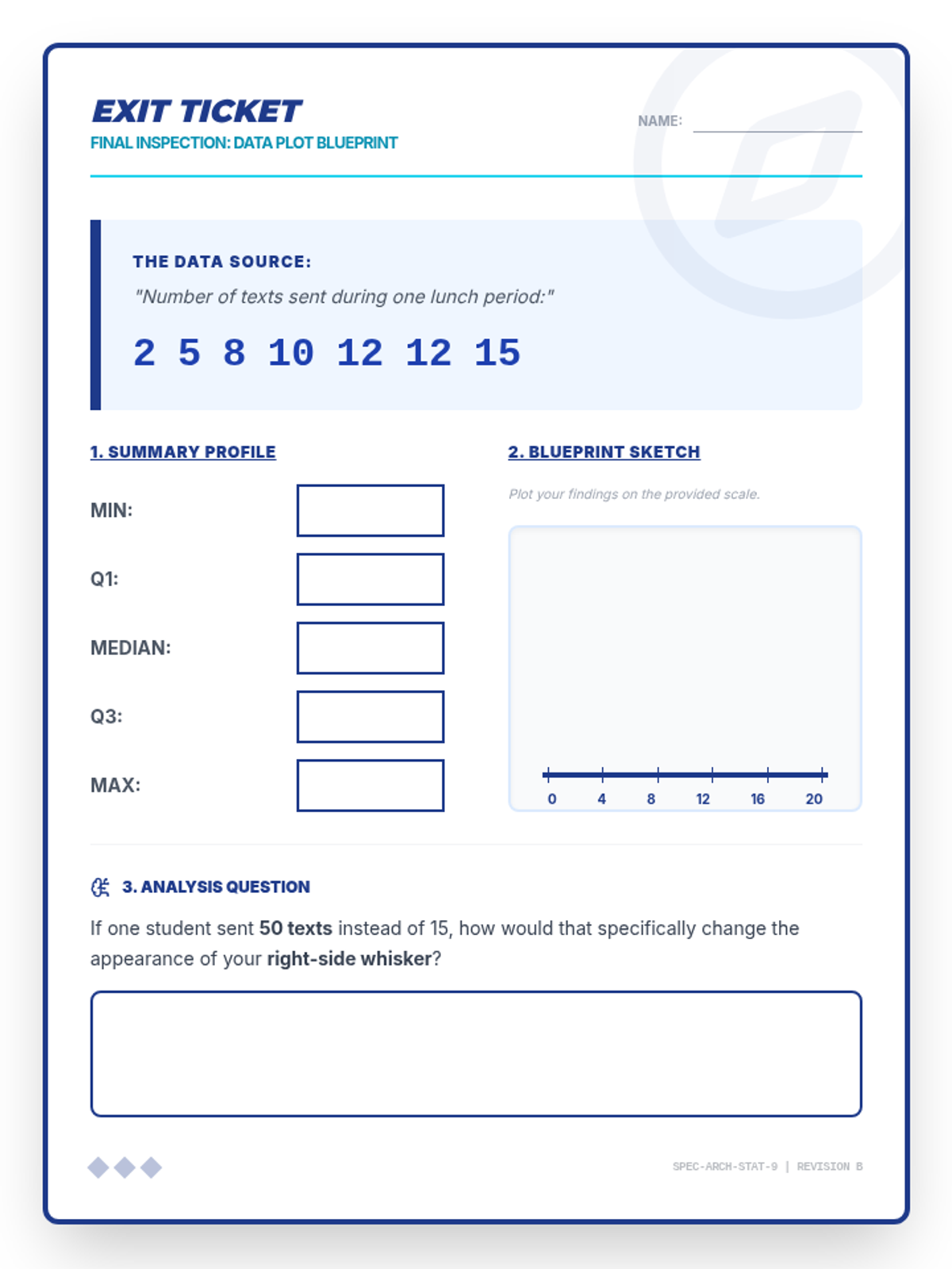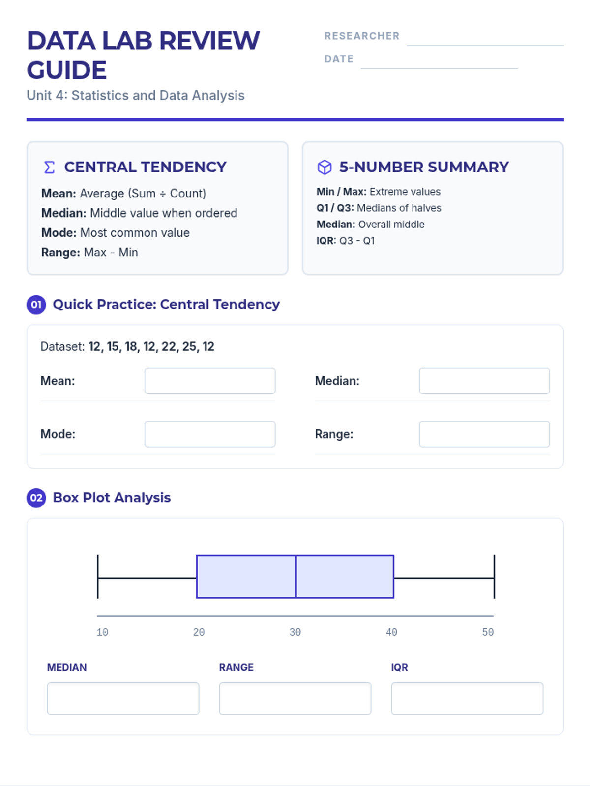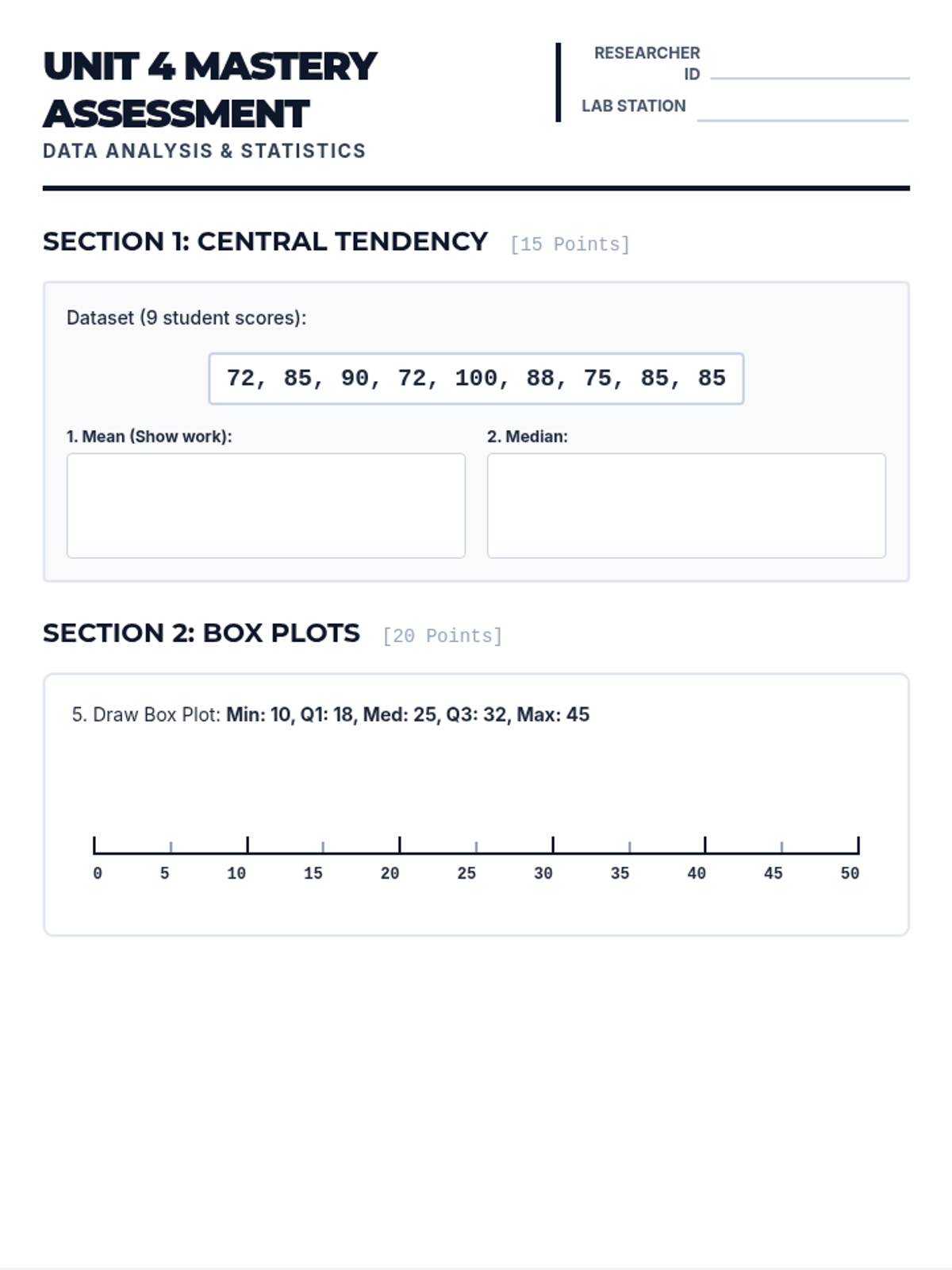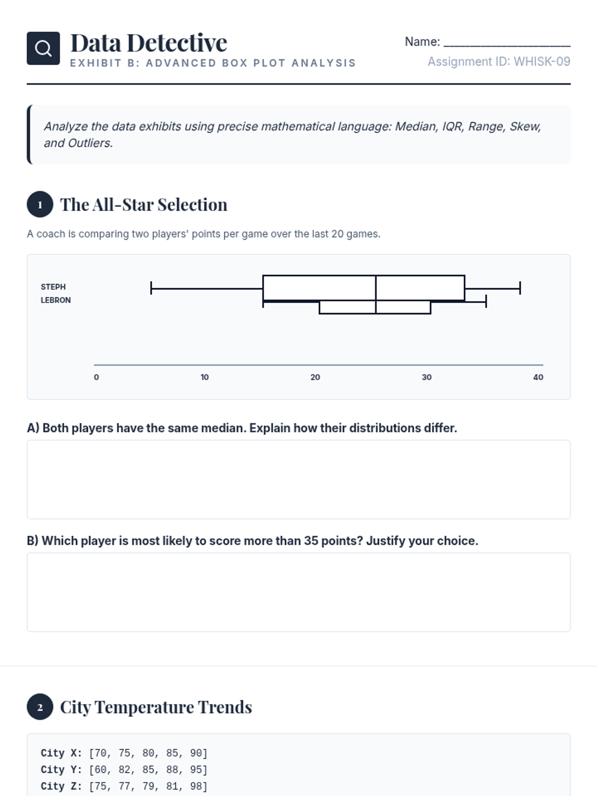 An independent practice worksheet with real-world scenarios including sports analytics and climate data. Now with improved box plot rendering, expanded response areas, and fixed page flow.