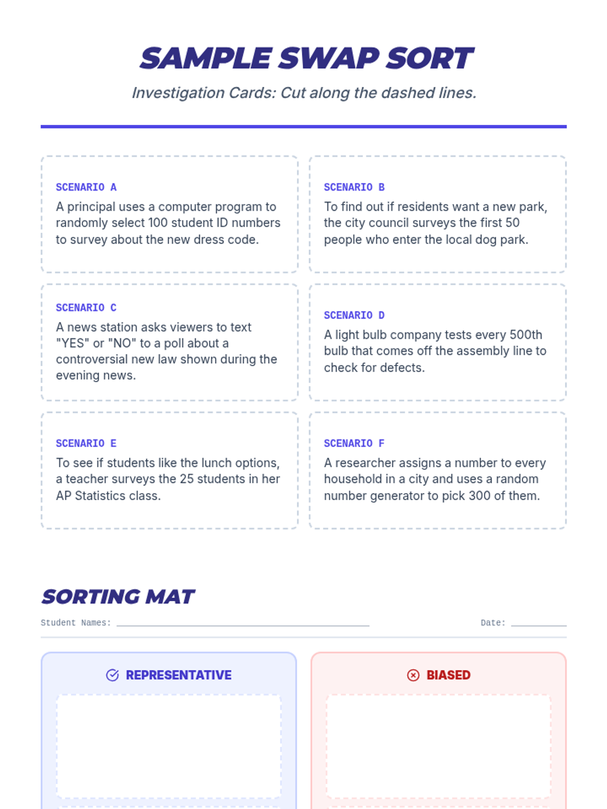 A hands-on card sort activity where students classify scenarios as representative or biased. Includes a cut-out sheet and a full-page sorting mat with improved layout and space for responses.