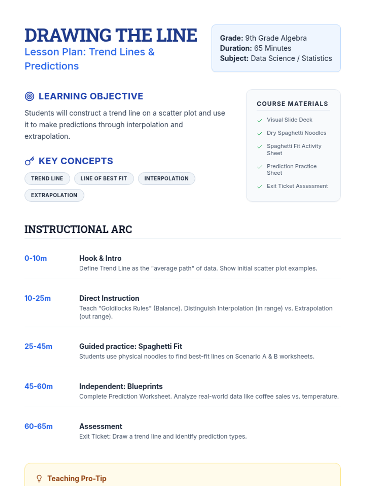 A concise lesson plan for a 65-minute 9th-grade algebra lesson on trend lines and data predictions.