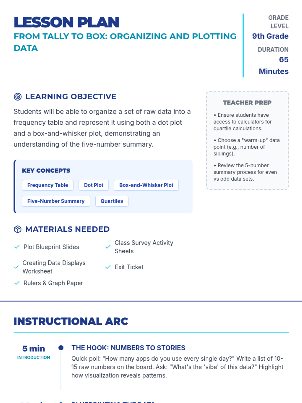 A detailed lesson plan for teaching data organization and plotting, featuring a clear instructional arc from frequency tables to box-and-whisker plots.