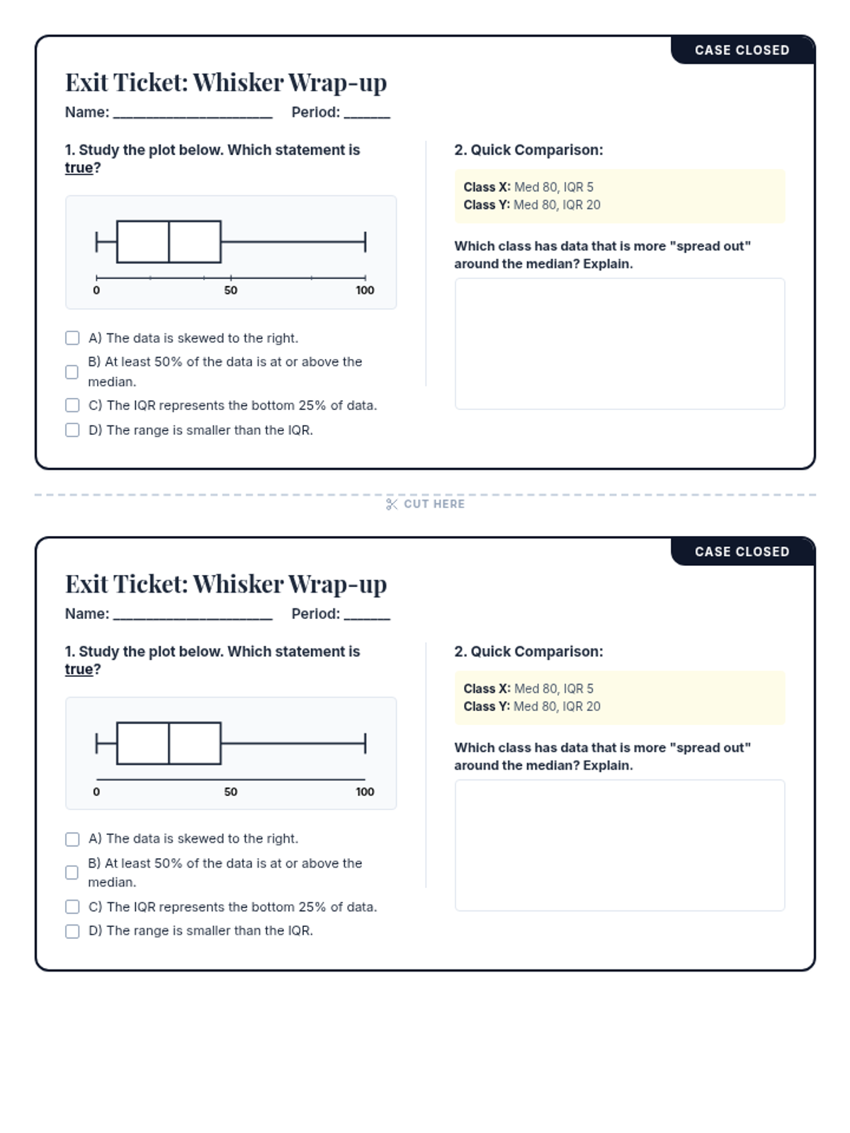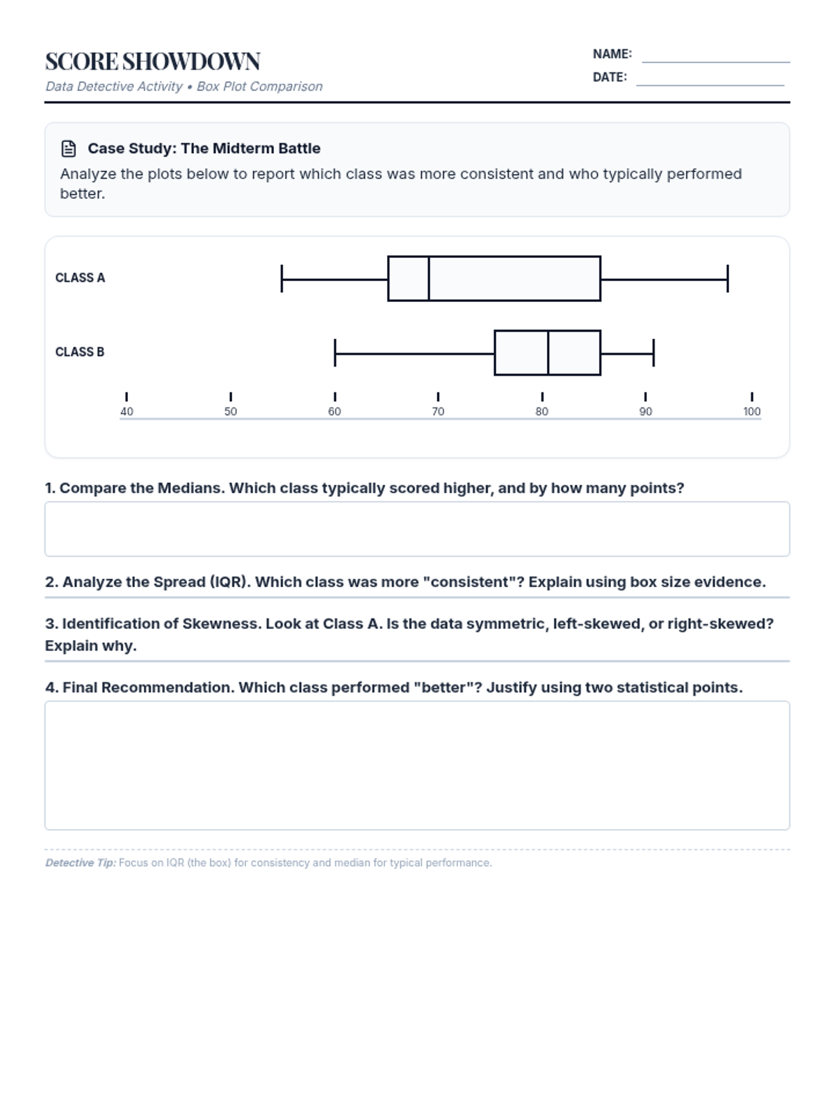 A guided practice activity where students compare two box plots representing midterm test scores. Now optimized for single-page printing with corrected visuals for skewness analysis.