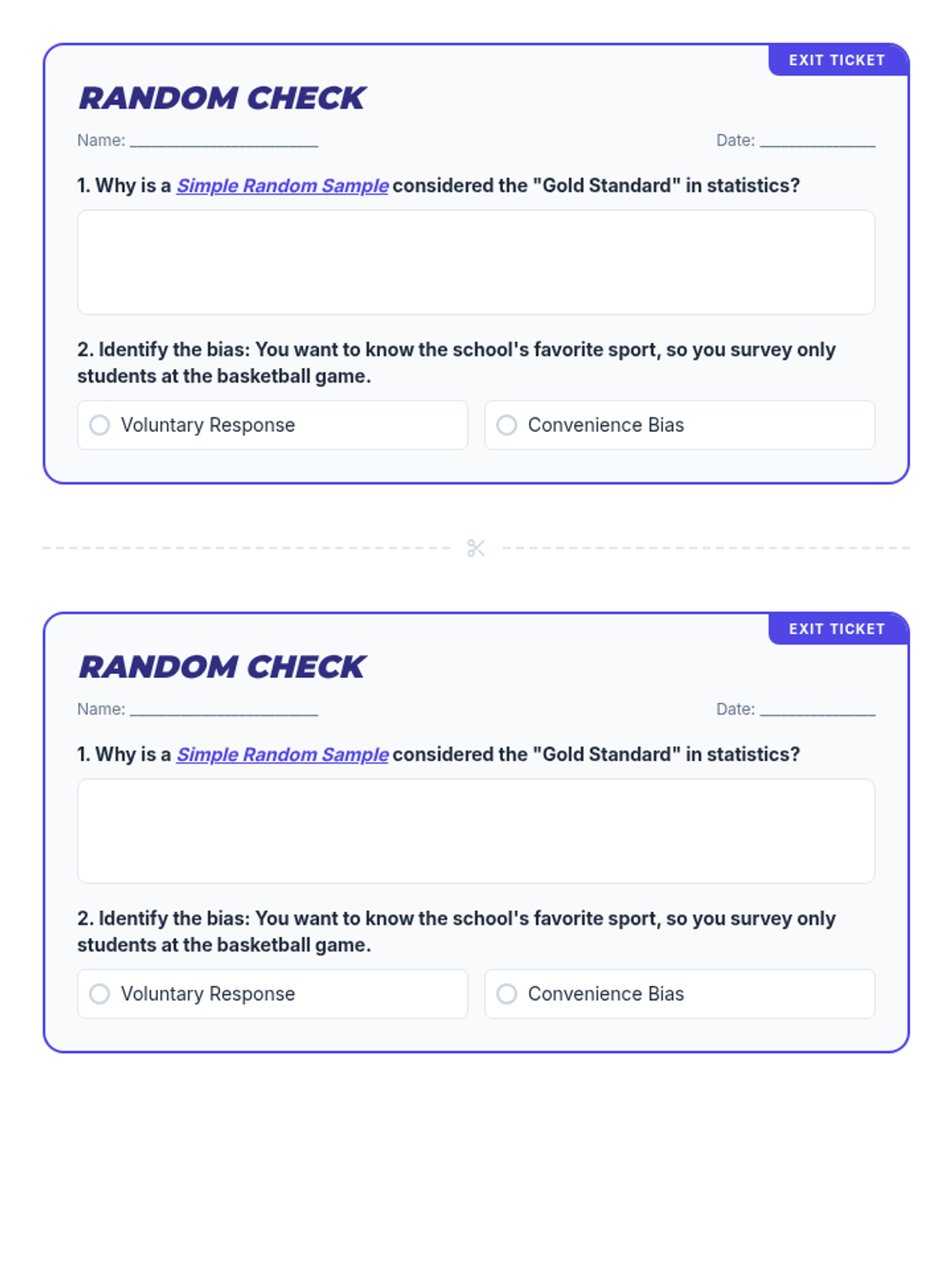A quick assessment tool for the end of the lesson. Features a short-response question on random sampling and a multiple-choice question on identifying bias. Optimized for single-page 2-per-page printing.