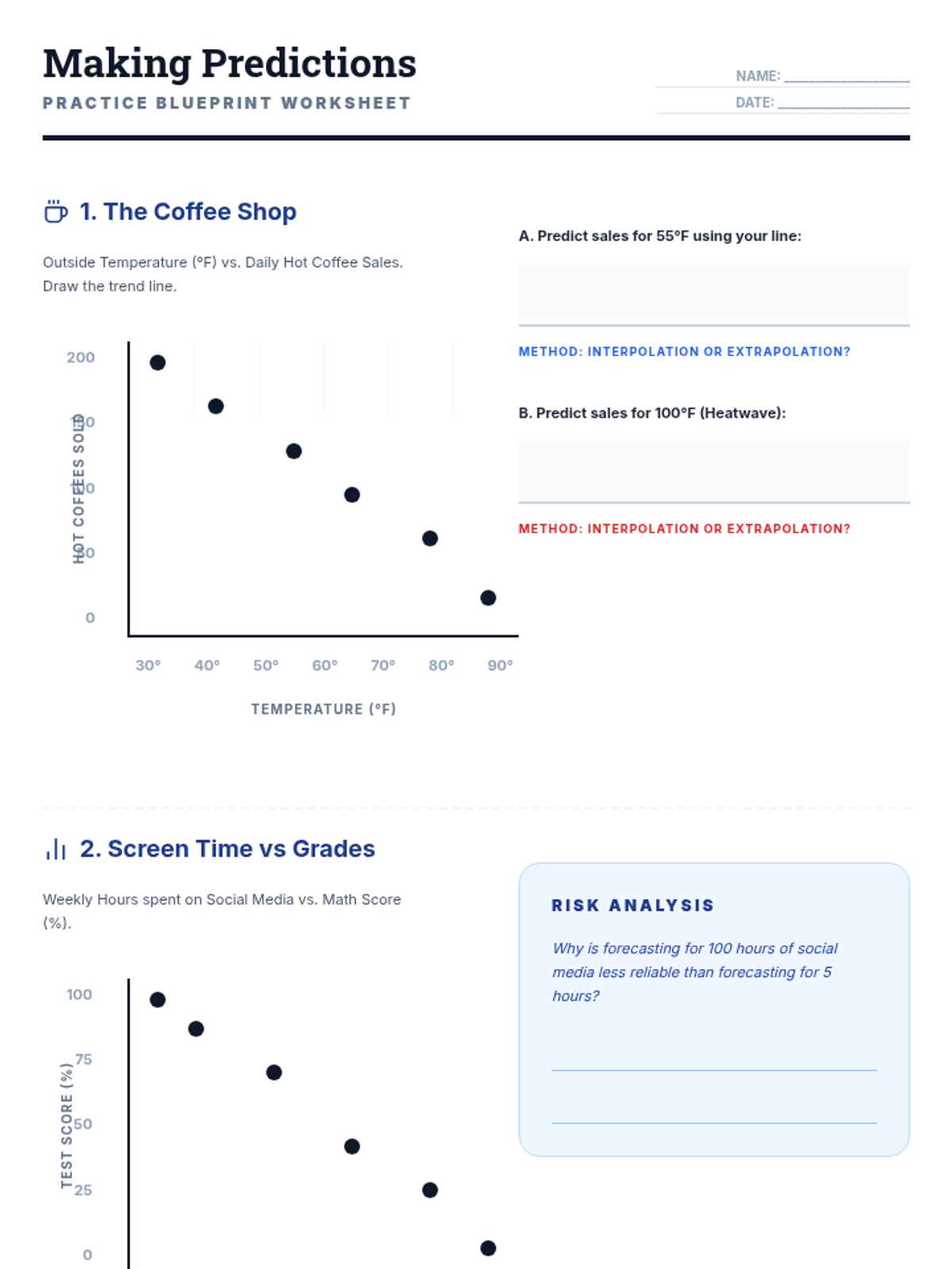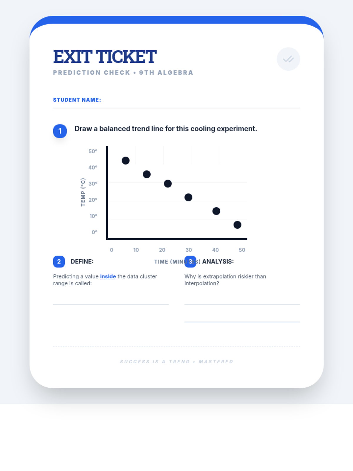 A quick formative assessment exit ticket to verify students can draw a trend line and distinguish between interpolation and extrapolation.