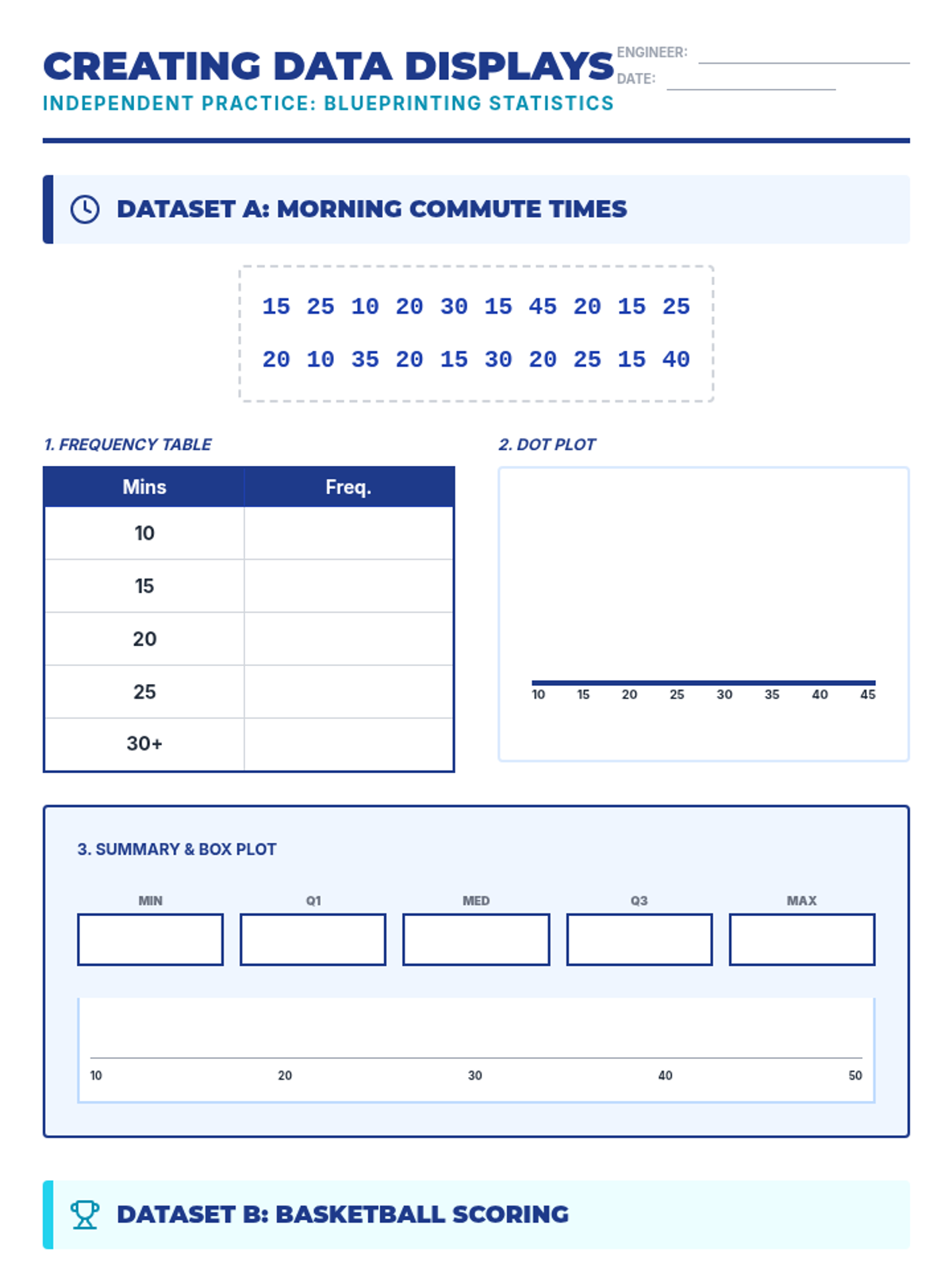 An independent practice worksheet where students analyze commute times and basketball scores to create frequency tables, dot plots, and box plots.