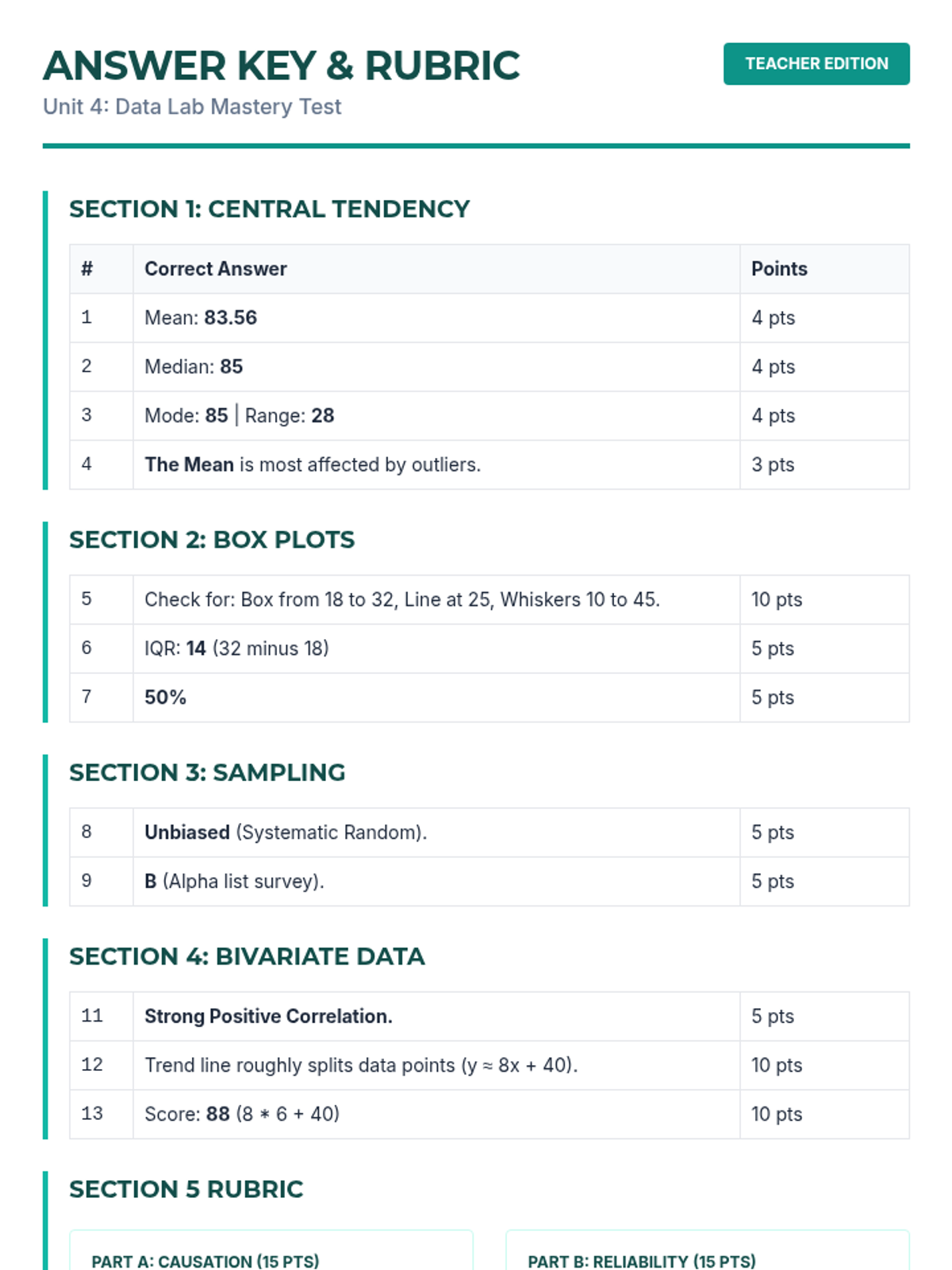 A detailed answer key and grading rubric for the Unit 4 Mastery Test. Includes step-by-step solutions for calculations, visual descriptions for graphs, and a clear point-based rubric for the open-response section.