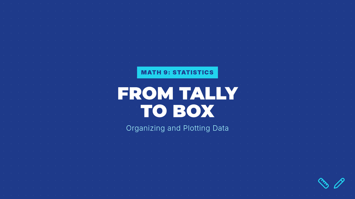 A visually engaging slide deck covering frequency tables, dot plots, and the construction of box-and-whisker plots using a "blueprint" aesthetic.