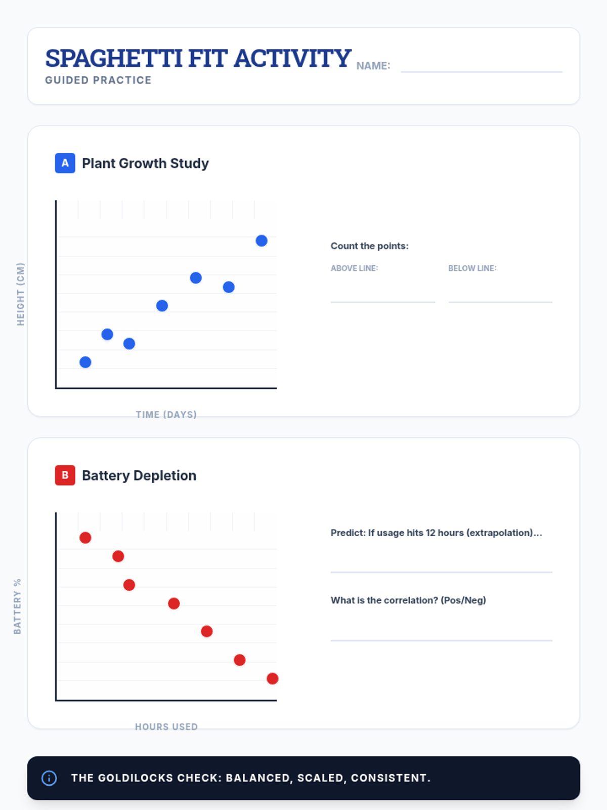 A hands-on activity sheet where students use physical spaghetti noodles to find the line of best fit on various scatter plots.