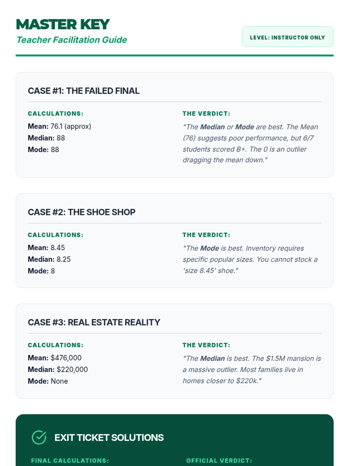 A teacher's answer key and facilitation guide for all calculations and scenarios presented in the lesson, including the exit ticket.