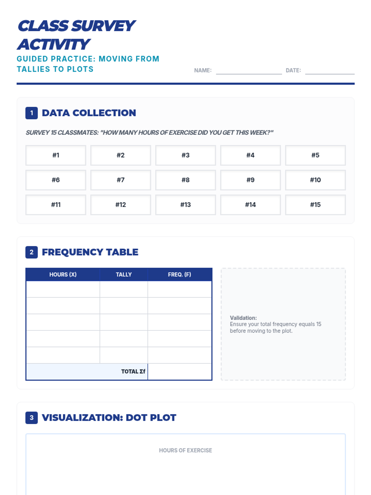A student activity sheet for conducting a class survey, organizing data into tables, and creating dot and box-and-whisker plots.