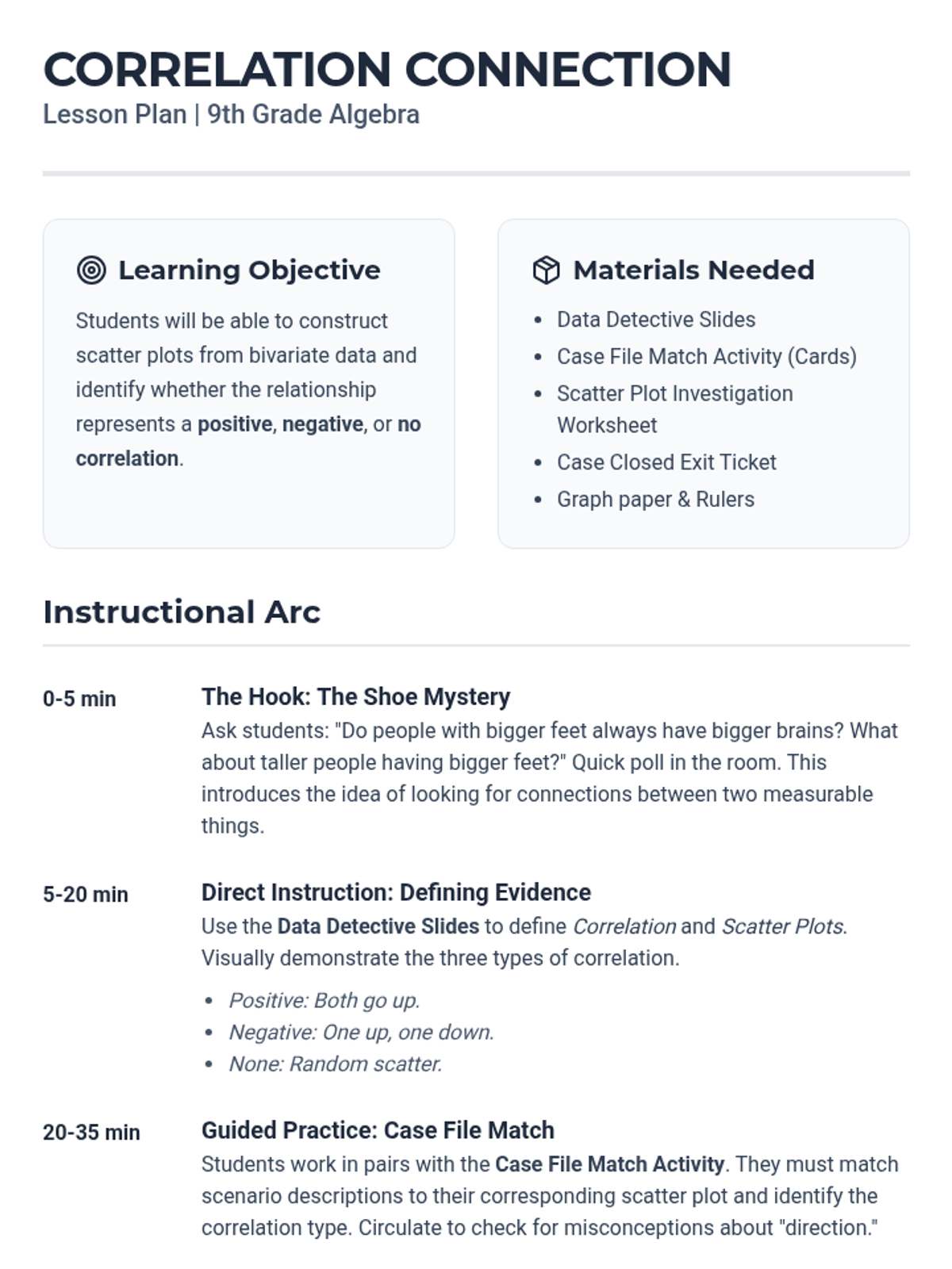 A comprehensive teacher's lesson plan for a 65-minute 9th-grade algebra class on correlation and scatter plots, featuring a 'Data Detective' theme.
