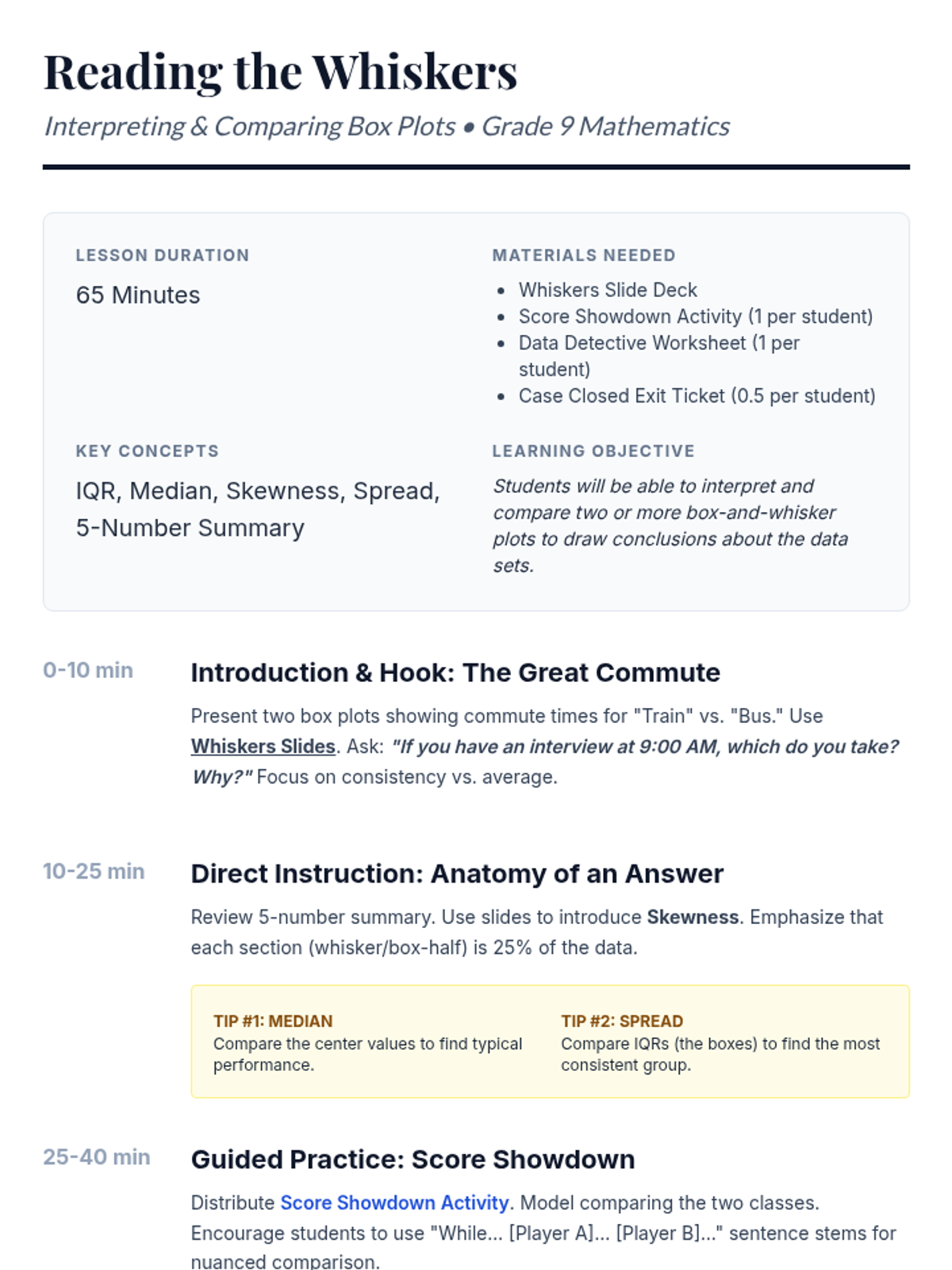 A comprehensive lesson plan for Grade 9 mathematics focused on interpreting and comparing box plots. Includes a 65-minute instructional timeline, teacher tips, and key focus questions for statistical analysis. Now with improved layout for print readability.