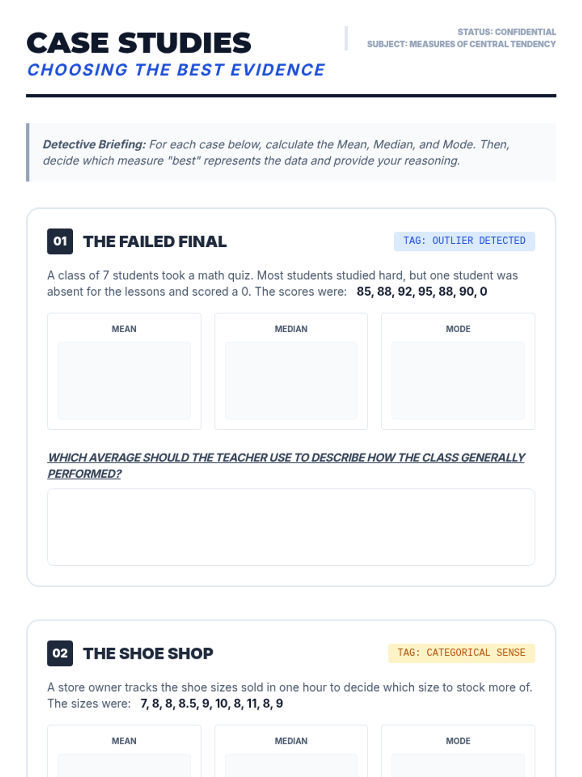 A practice worksheet featuring three real-world scenarios that challenge students to calculate mean, median, and mode and justify the best choice in the presence of outliers.