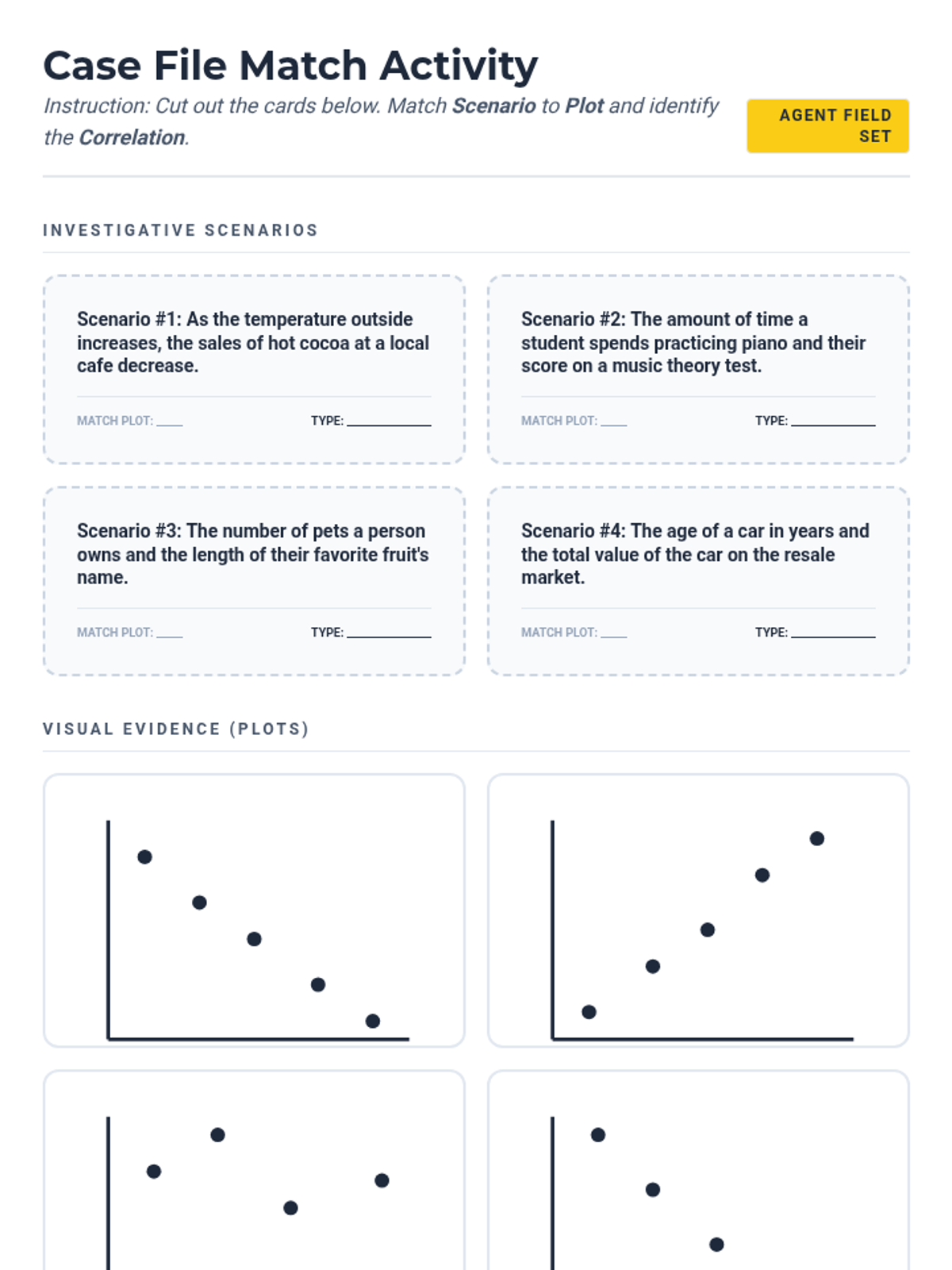 A hands-on matching activity where students pair real-world scenarios with their corresponding scatter plot graphs and identify the correlation type.