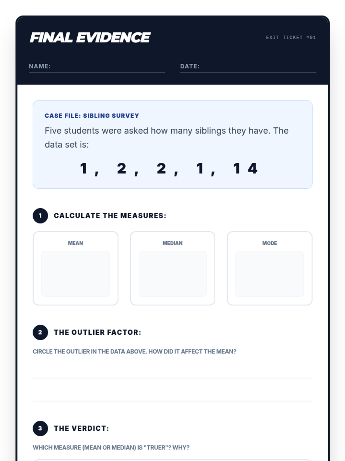 A concise assessment for students to complete at the end of the lesson, requiring them to calculate central tendency and justify their choice for a specific data set with an outlier.
