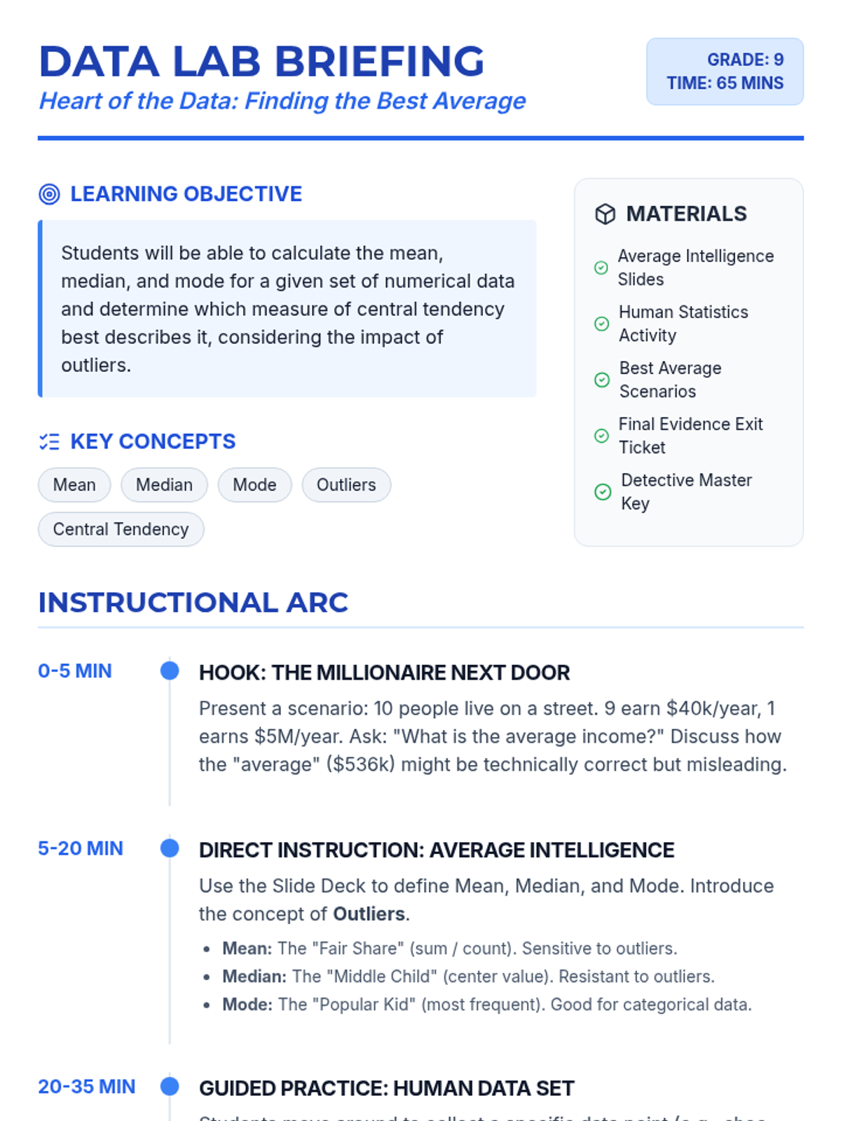 A comprehensive 65-minute lesson plan for teaching mean, median, and mode to 9th graders, featuring a 'Data Detective' theme and a structured instructional arc.