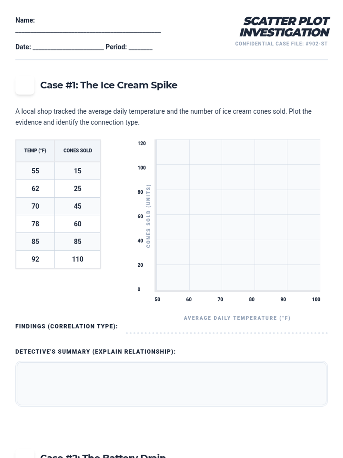 A worksheet for students to practice creating scatter plots from real-world data sets and identifying the resulting correlation types with a 'Data Detective' narrative.