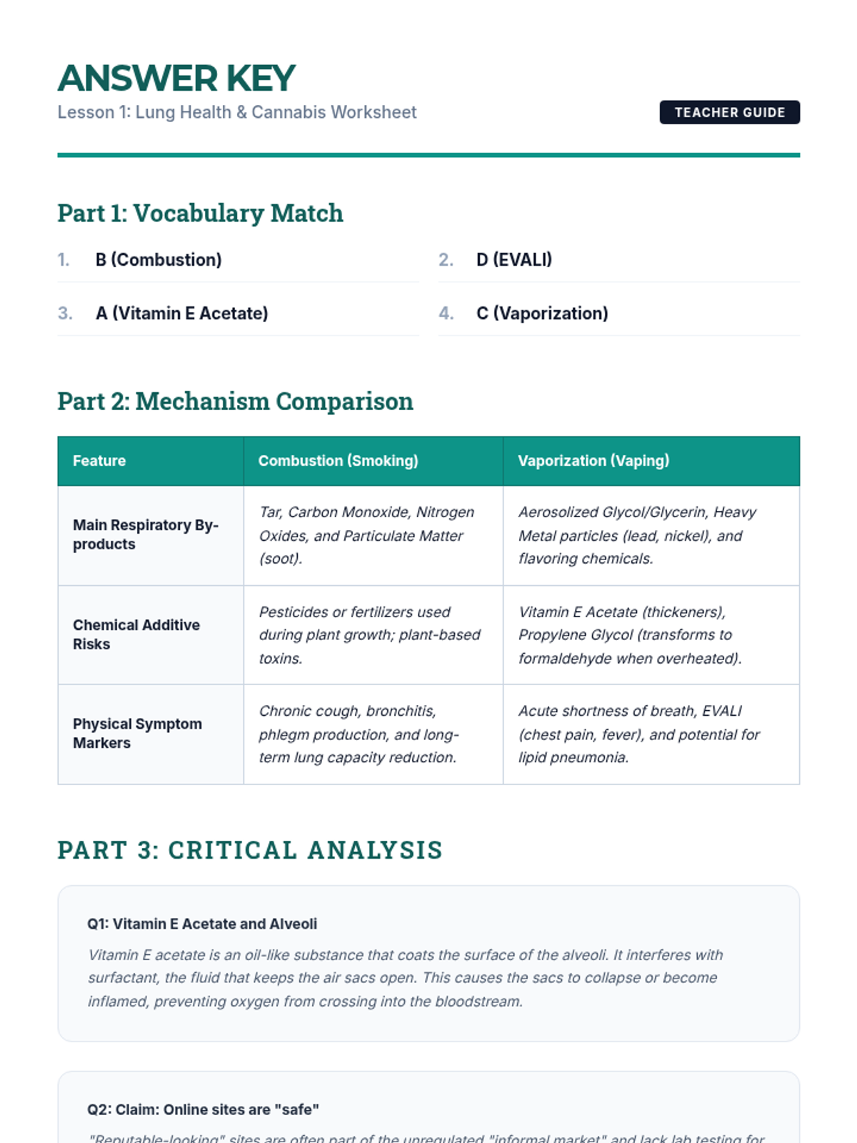 An answer key for the Lesson 1 Lung Health worksheet, providing definitions for key terms and a completed comparison table for combustion vs. vaporization.