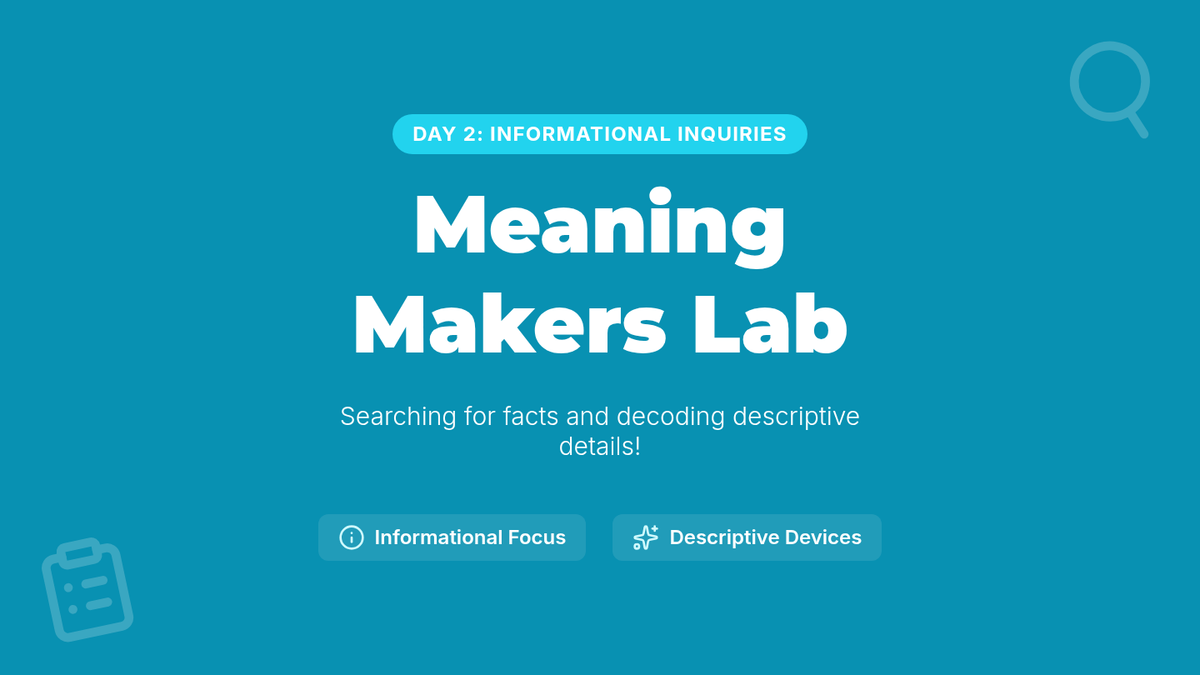 Visual presentation for Day 2 of the Meaning Makers Lab. Explores informational text structure and descriptive devices (alliteration, personification, hyperbole) through a 'meaning maker' inquiry lens.