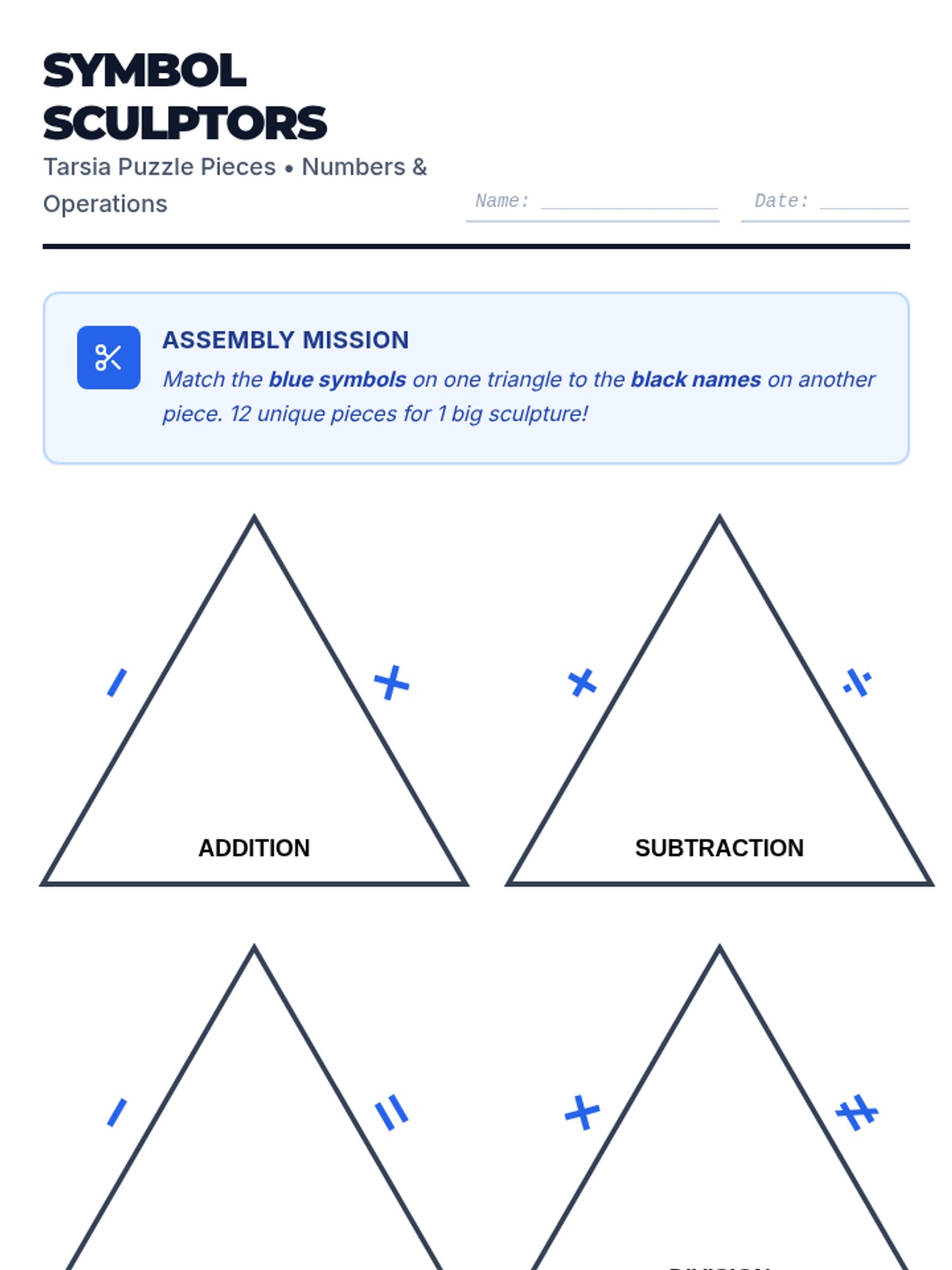 A student activity sheet containing 12 triangular puzzle pieces with mathematical symbols and their names. Students must cut out and match the edges to complete the challenge. This version fixes alignment and ensures no piece contains its own match.