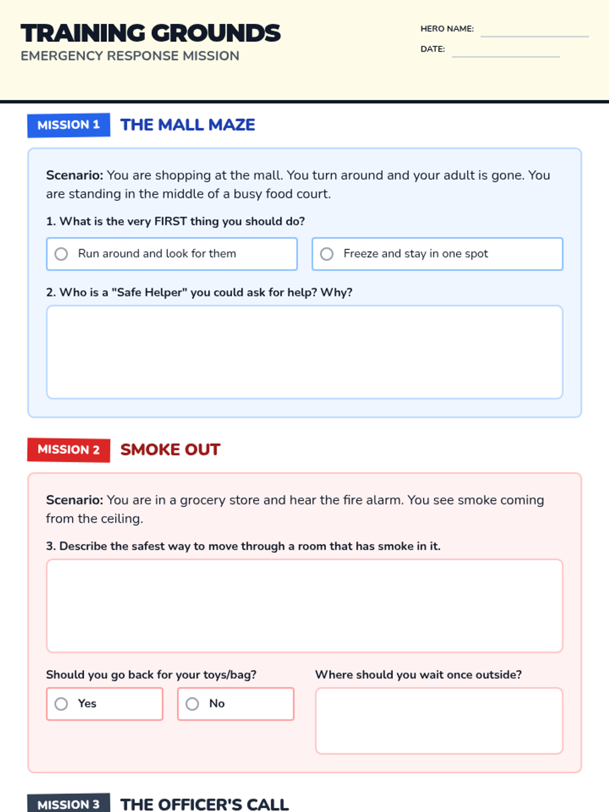 A scenario-based worksheet designed as a 'Training Grounds' mission where students apply safety protocols to three different emergency situations.