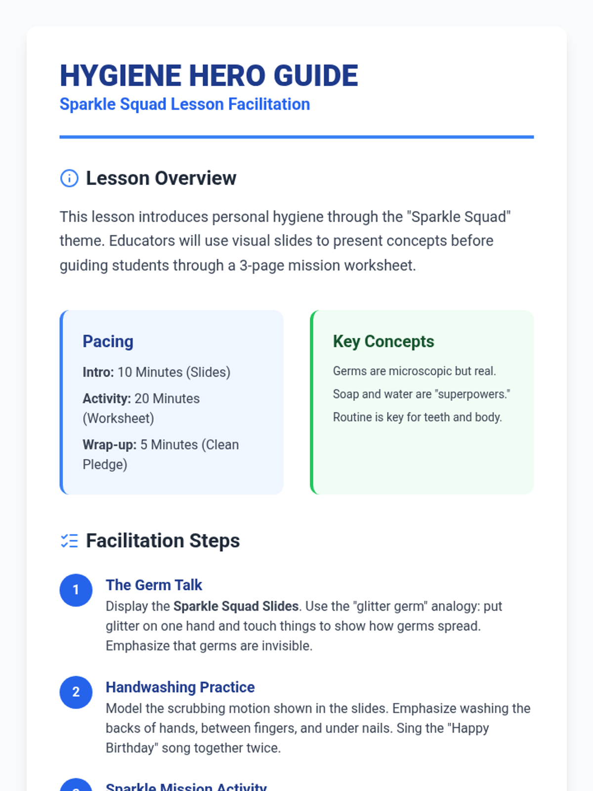 A detailed teacher guide featuring lesson pacing, a "glitter germ" analogy demonstration, discussion prompts, and differentiation strategies for teaching kindergarteners about hygiene.