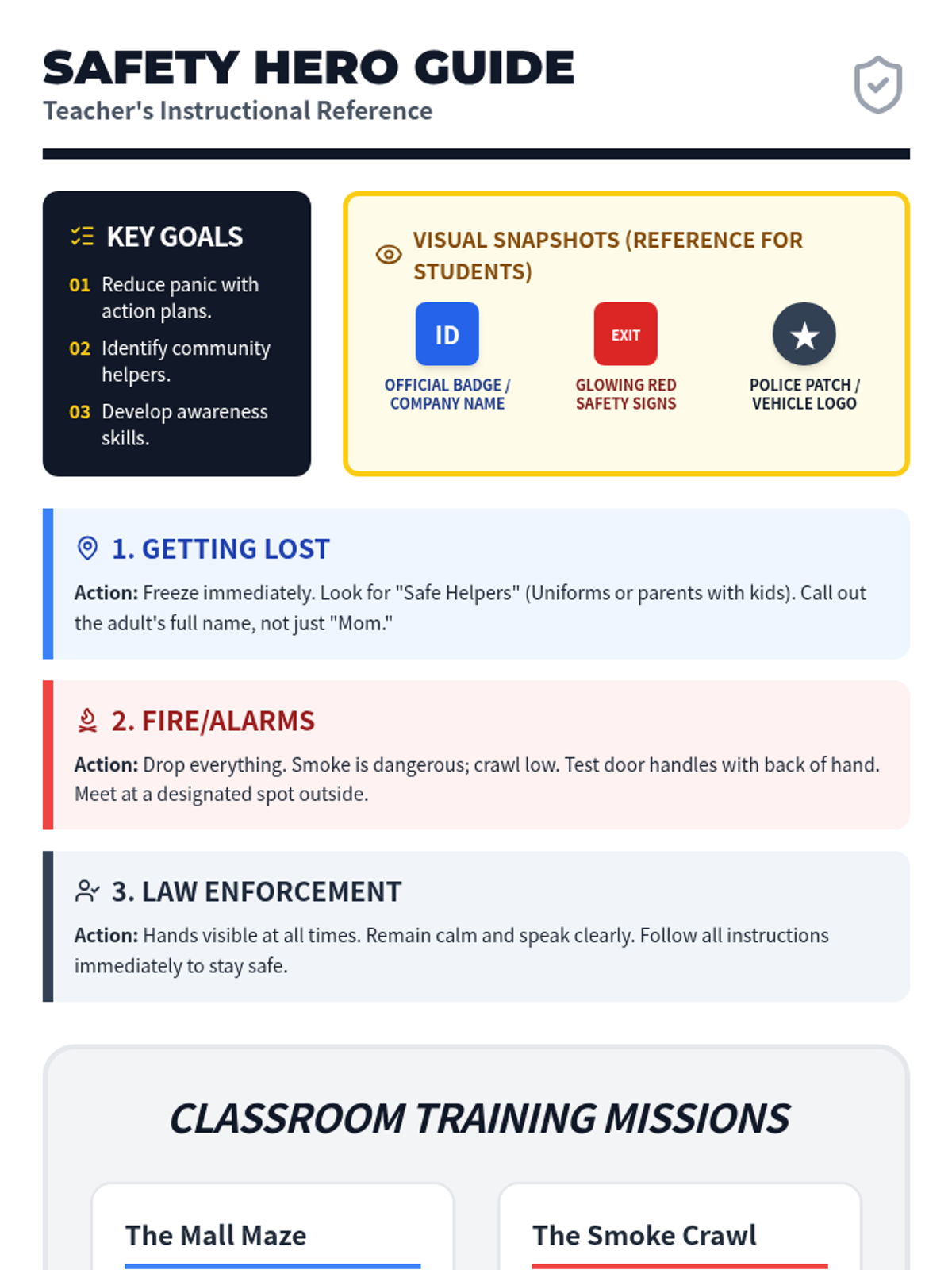 A high-energy, comic-book themed presentation deck covering three critical community safety scenarios: getting lost, fire emergencies, and interacting with police.