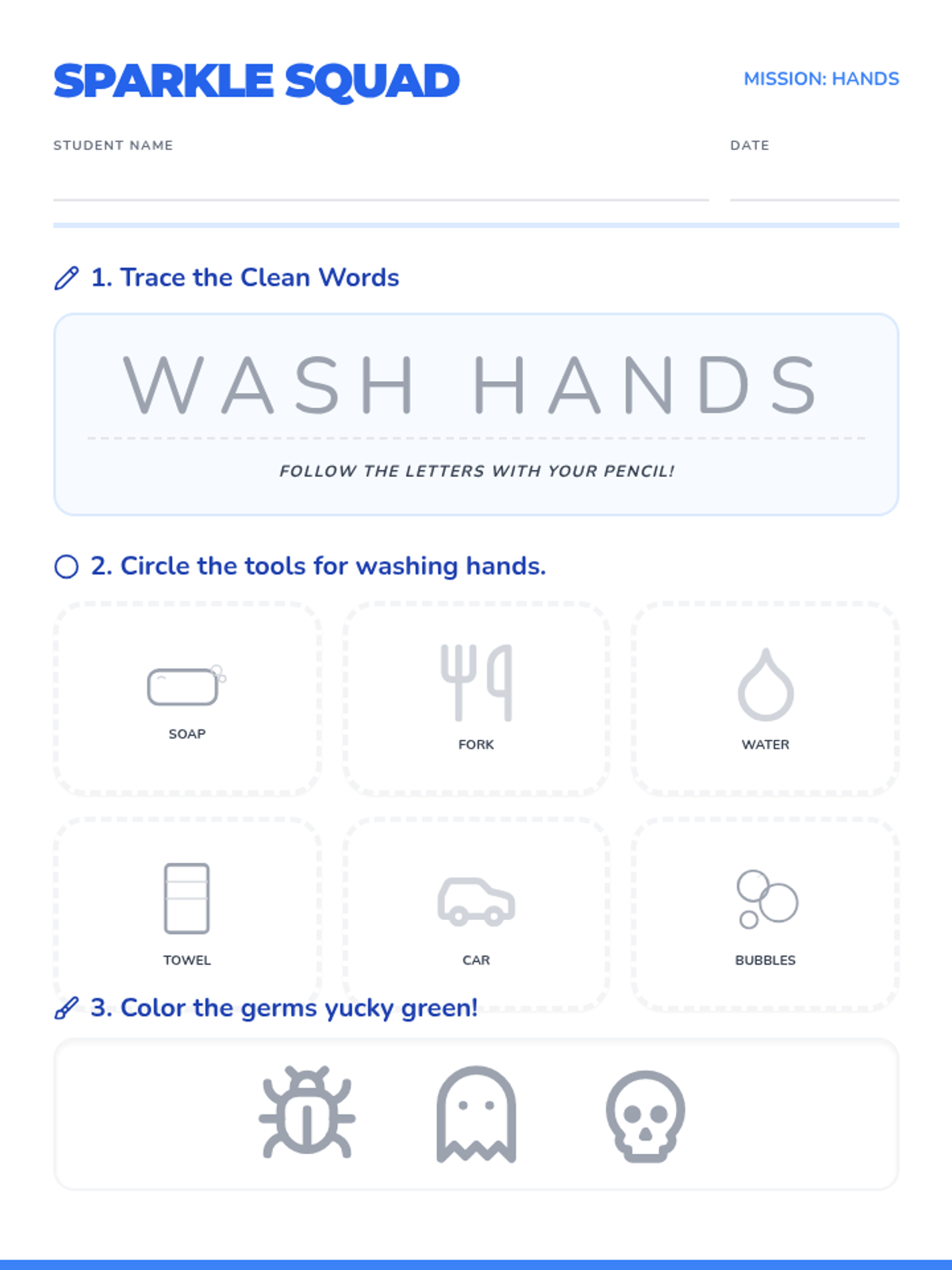 A comprehensive 3-page activity packet for kindergarten students. It features tracing exercises for hygiene vocabulary, "circle the clean choice" visual puzzles, and coloring sections for handwashing, dental care, and bathing. Now with more literal illustrations and improved contrast.