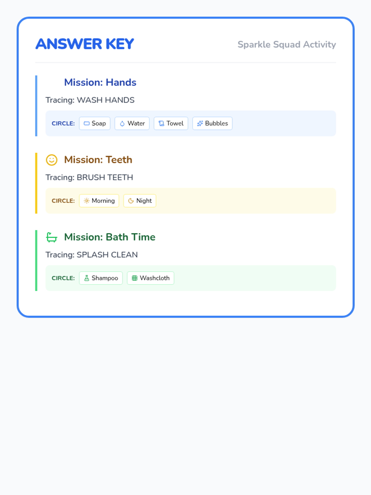 A clear answer key for teachers, outlining the correct responses for the "Sparkle Squad" worksheet circling and tracing activities. Updated to reflect improved iconography.