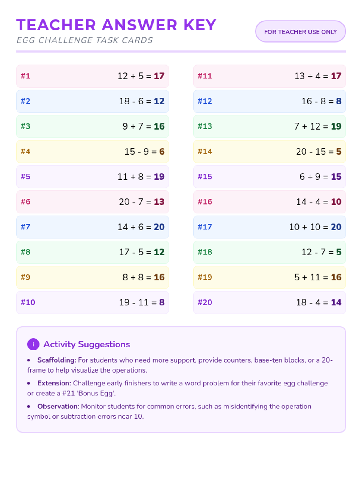 A comprehensive answer key for teachers to quickly grade the Egg Hunt Math activity, including suggested differentiation and observation tips.