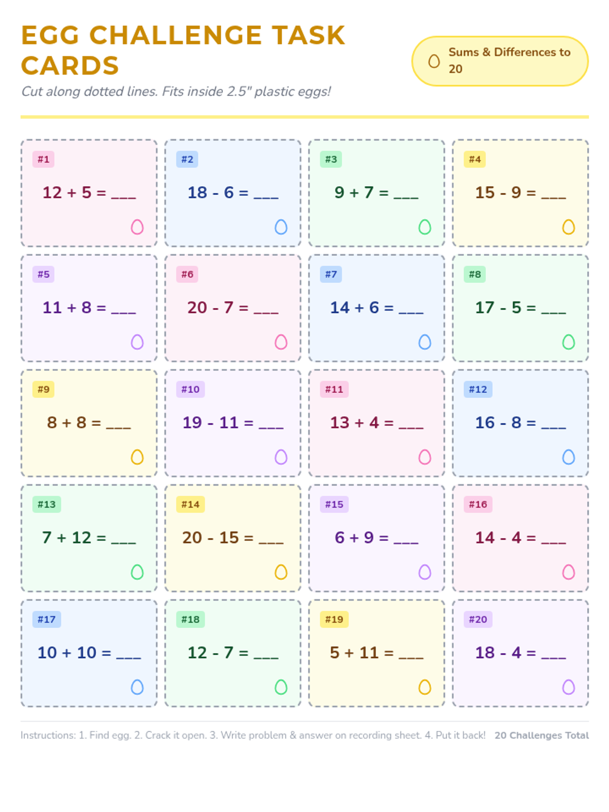 Small, numbered task cards featuring mixed addition and subtraction problems within 20, designed to be cut out and placed inside plastic eggs for a hands-on math activity.