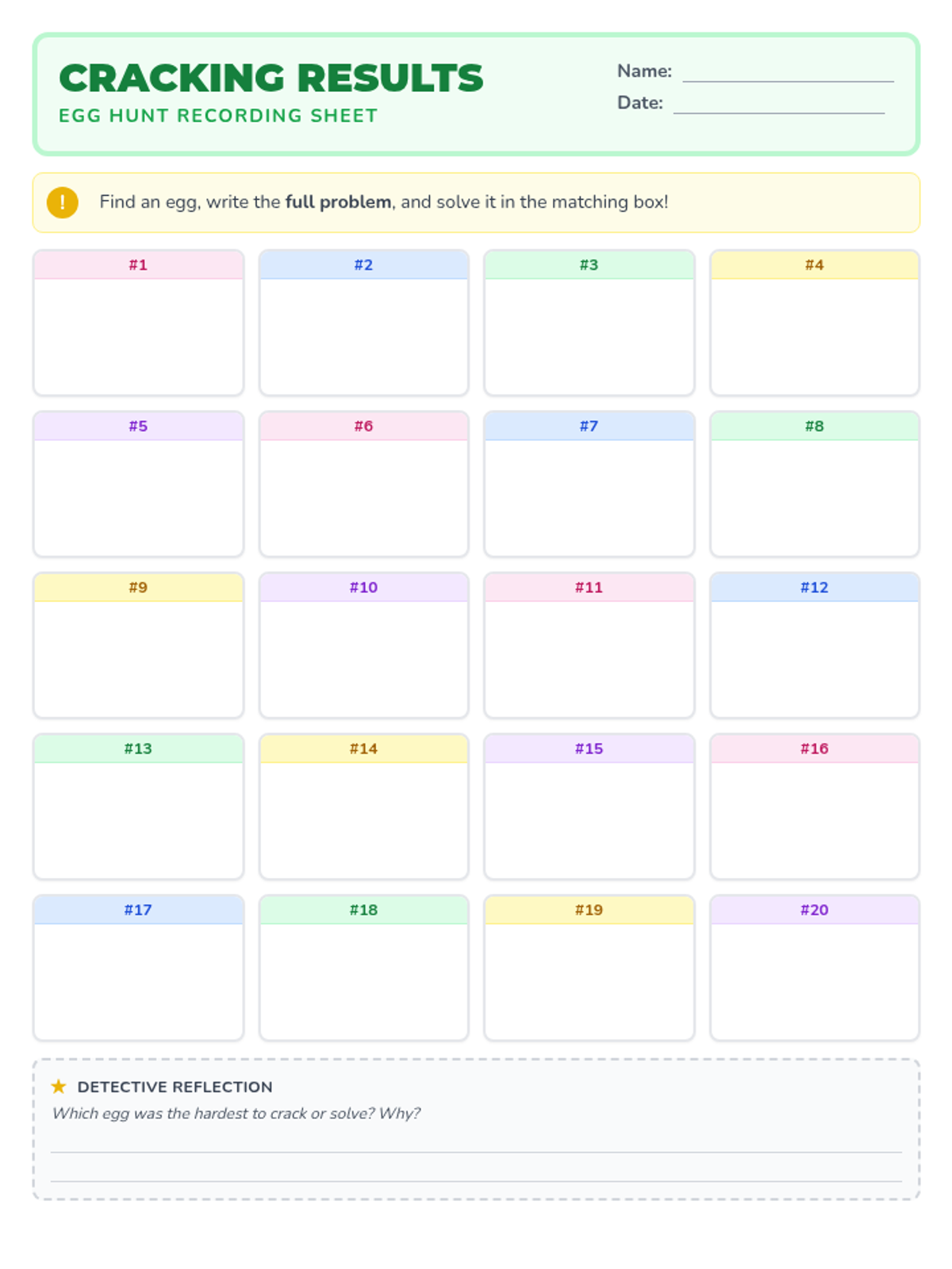 A student recording sheet for the Egg Hunt Math activity where they can record their equations and solutions for all 20 egg challenges.